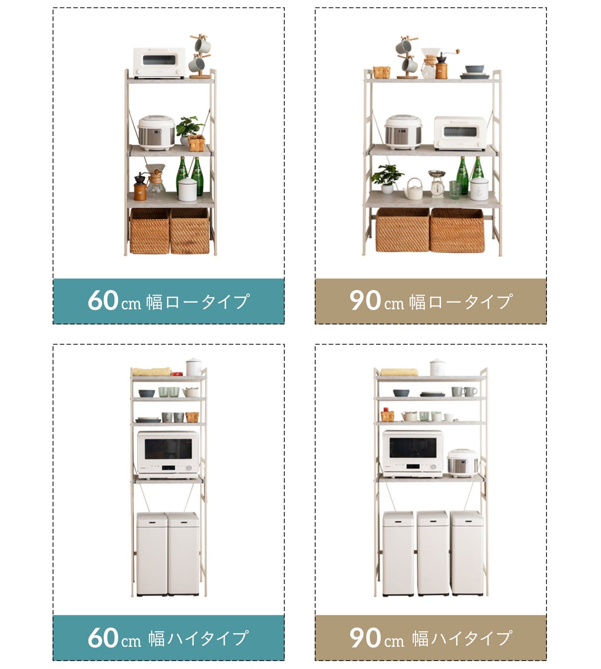 高さと幅が異なる4タイプのキッチンラックから、あなたのキッチンに合うものをお選びいただけます!