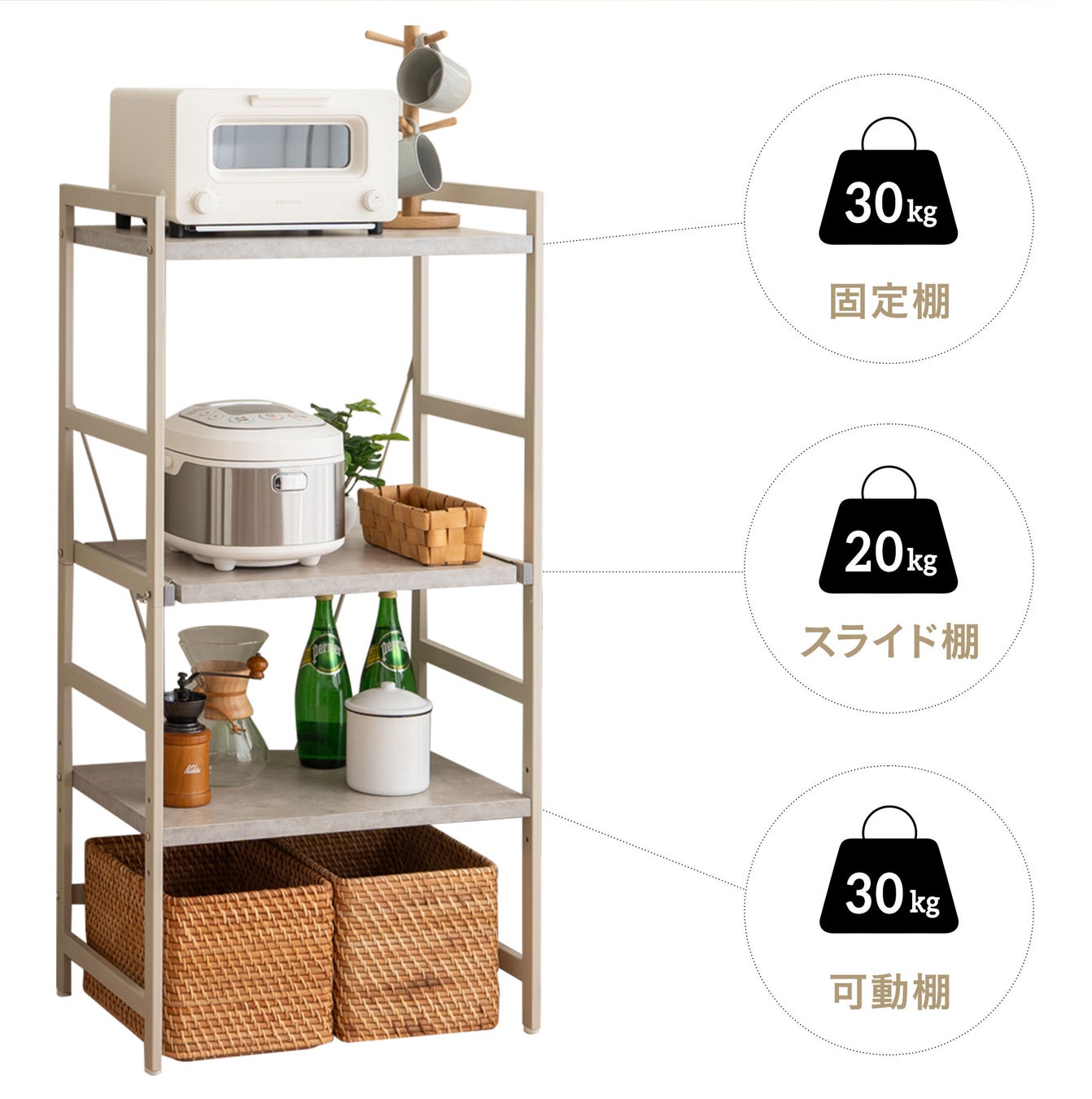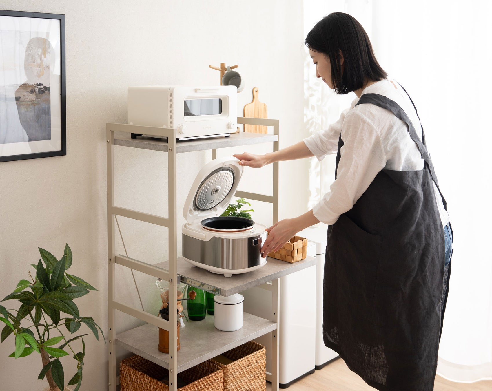 セラミック調のボードで洗練された印象キッチンラックは、どんなインテリアにも馴染みます。見た目だけでなく、ポットや炊飯器などの蓋つき家電もたっぷりスペースで快適にお使いいただけます。スライド式トレーだから、使用する際もスムーズです。