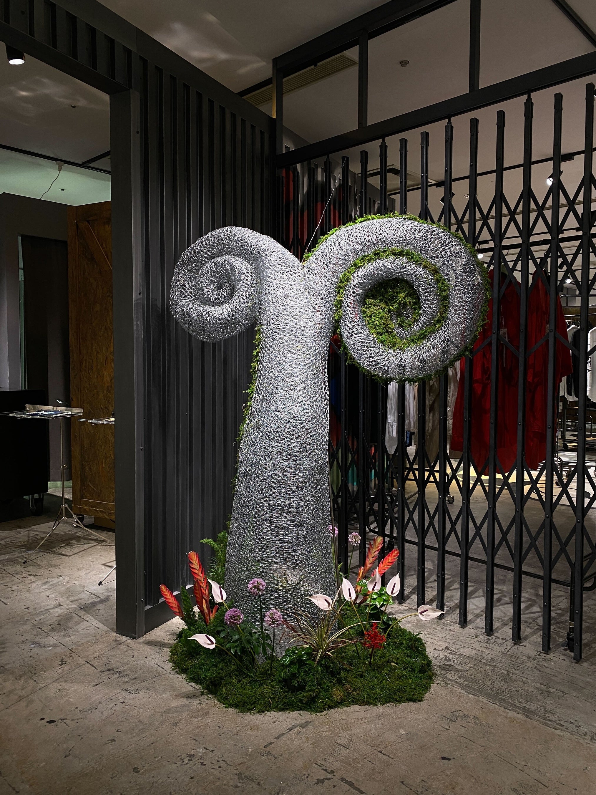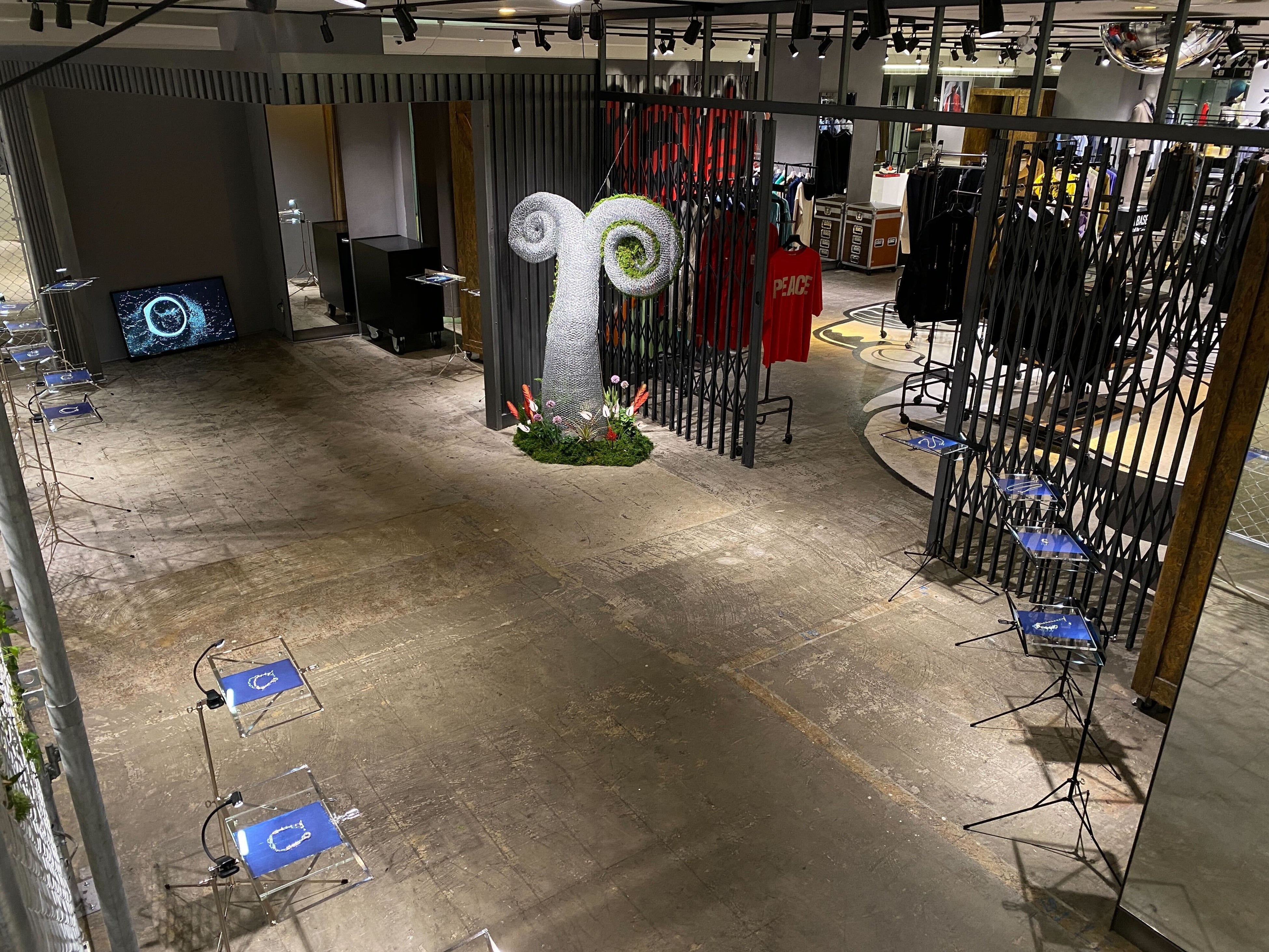 展示会場装飾については、「フラワーショップ田中」とコラボレーション。fixture初となるポップアップストアの瑞々しさや、会場の持つインダストリアルな素材感に着想を得た装飾を行っている。