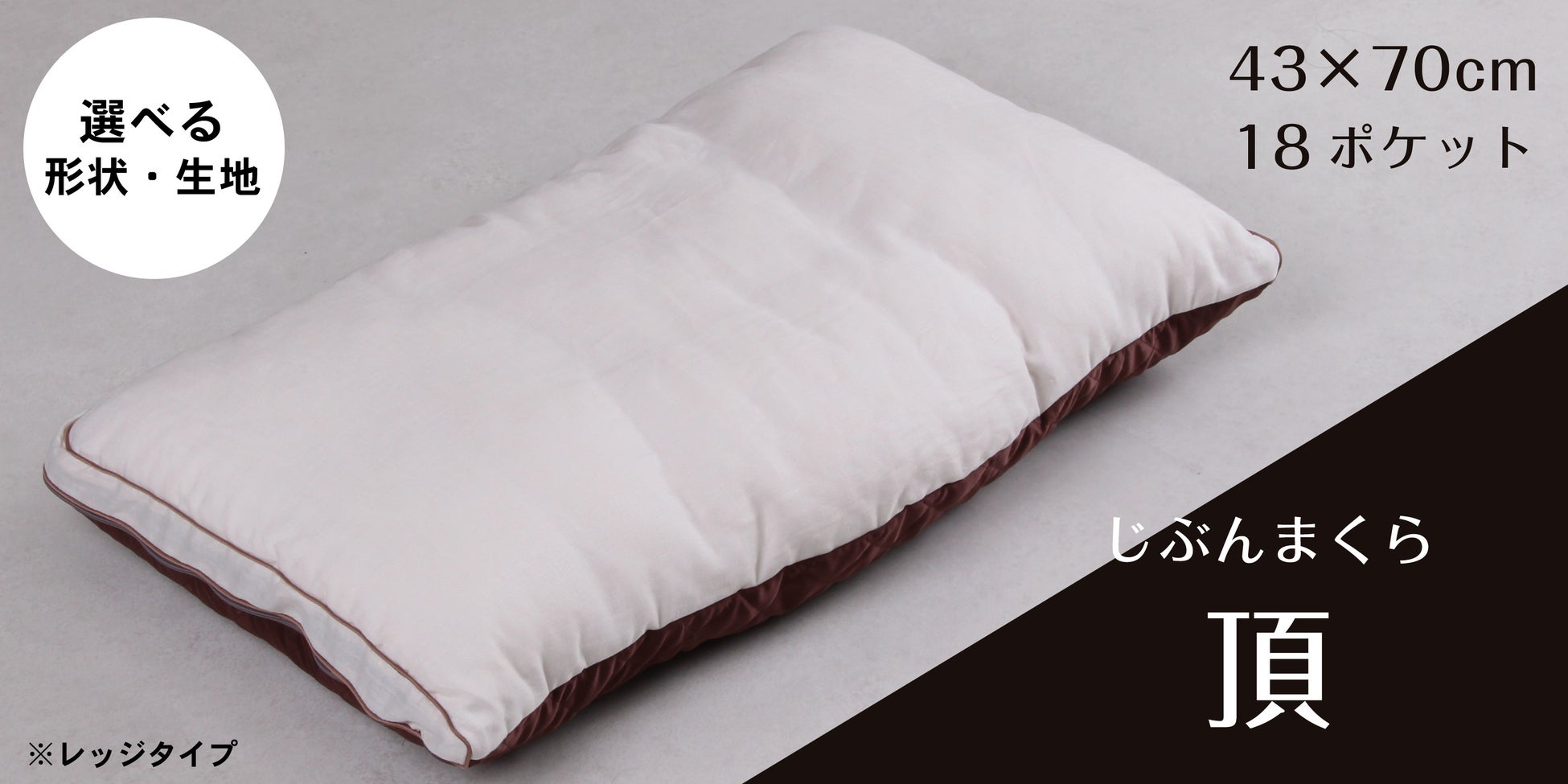 枕のサイズが 43 × 63 cm の「レギュラー」、43 × 70 cmのワイドタイプ枕「プレミアム」、最上級フラッグシップモデル「頂(いただき)※」の、3種類のギフト券を販売しております。