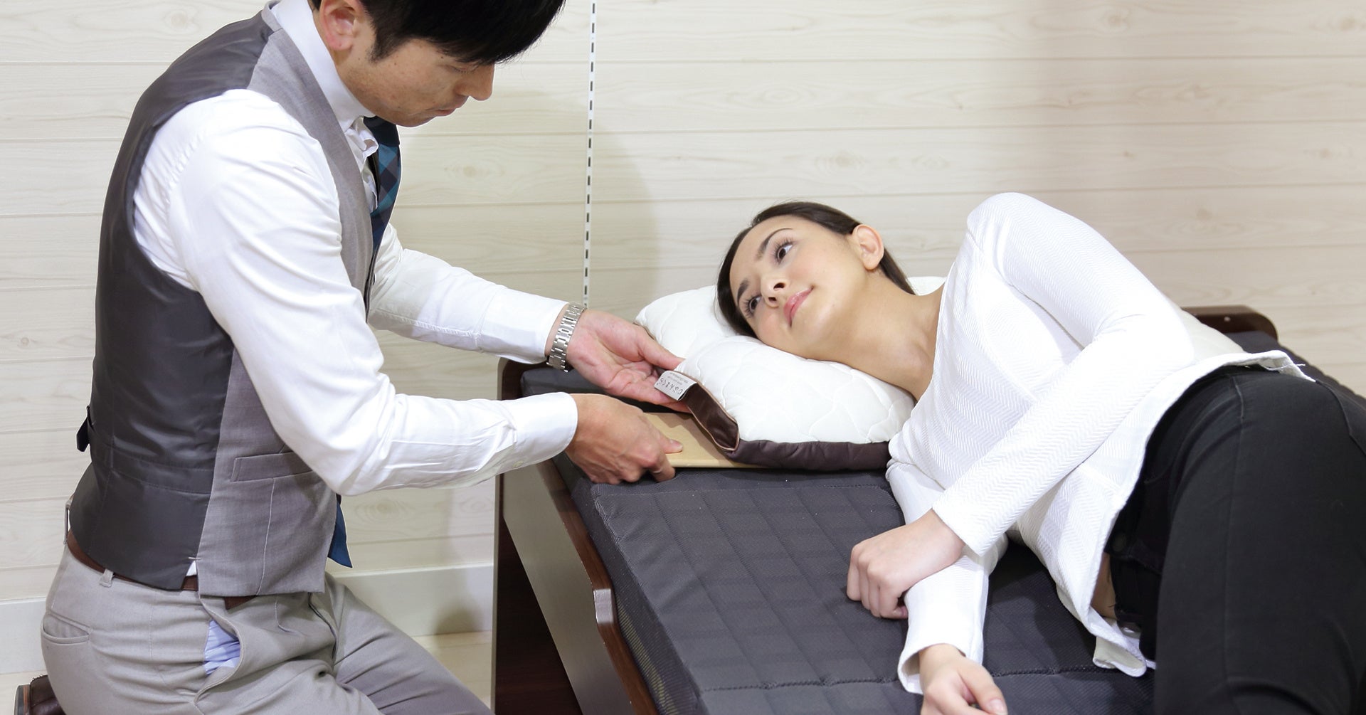 首の高さはもちろん、全身の測定により、一人ひとりの体型、身長、体重の違いまでも測定し、「じぶんまくら」に反映していきます。
