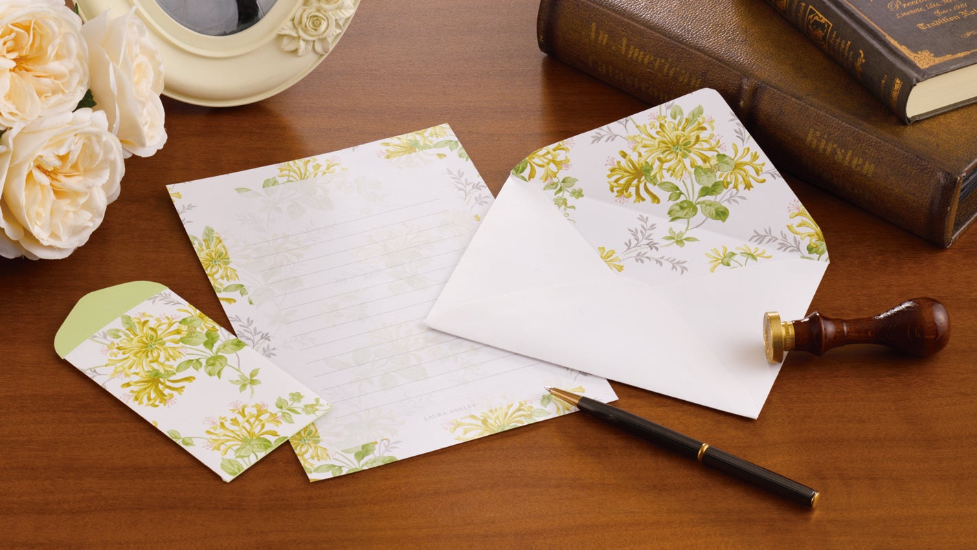 オリジナルテキスタイルを中心に「家」と「暮らし」を美しく豊かに彩る英国のライフスタイルブランド「ローラ アシュレイ」。マルアイは、その愛されつづけるプリントデザインを使用し封筒や便箋などのステーショナリーアイテムを展開しています。