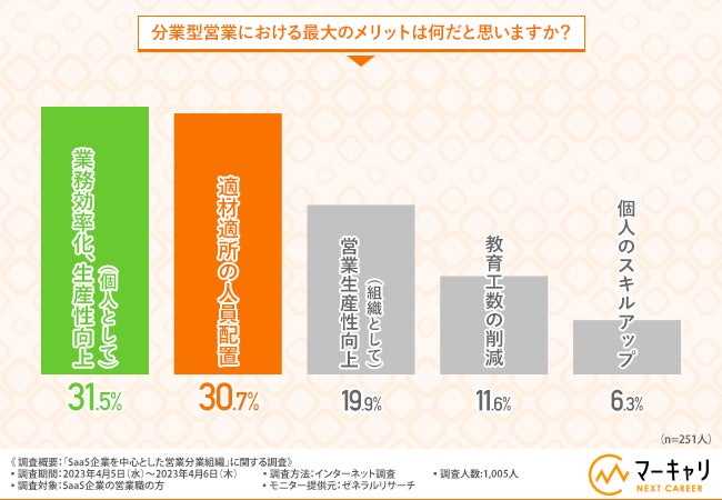 続いて、「分業型営業における最大のメリットは何だと思いますか?」と質問したところ、『(個人として)業務効率化、生産性向上(31.5%)』と回答した方が最も多く、次いで『適材適所の人員配置(30.7%)』『(組織として)営業生産性向上(19.9%)』と続きました。