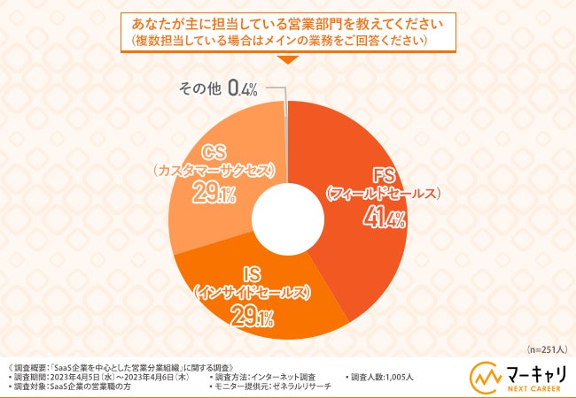 担当業務は『FS(フィールドセールス)(41.4%)』と回答した方が最も多いものの、『IS(インサイドセールス)(29.1%)』『CS(カスタマーサクセス)(29.1%)』と人数比としては比較的均等ということが判明しました。