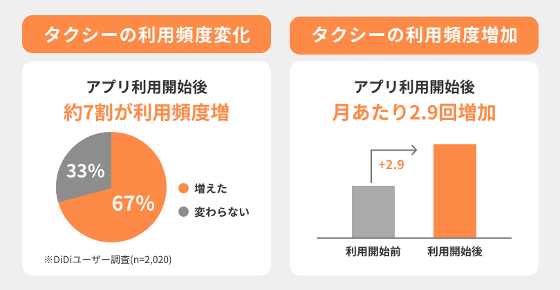 DiDiの利用前後では平均3.9回/月から6.8回/月と、利用回数が増えたことがわかりました。