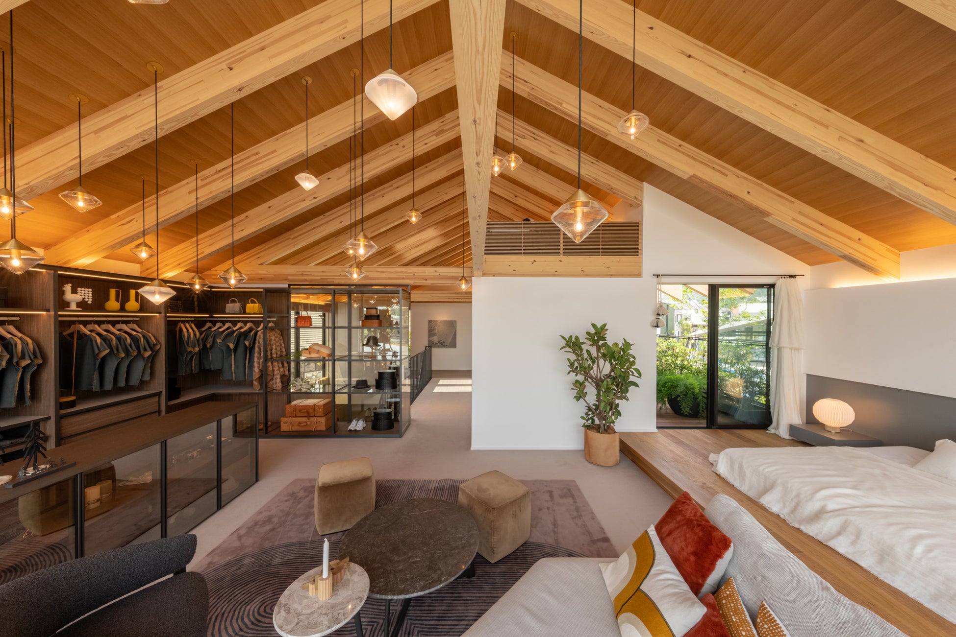 切妻屋根の小屋裏空間はBF構法による木造ラーメン構造の登り梁を架構とし、高い剛性*5による連続する全面吹抜けの大空間を実現。登り梁組みによる屋根面剛性の高さは、火打梁や小屋筋違のない美しい意匠を可能としています。リズミカルに連続する登り梁組みは、最大天井高4.5m、桁行長さは屋根面全域の14.5m。豊かな木組みの吹抜け空間を「樹冠」と命名しました。開放的な大空間は住む人に建築の更なる可能性を感じさせます。住友林業の箕面第2展示場(大阪府箕面市今宮)に実装しており、登り梁構造の美しい空間を体感いただけます。