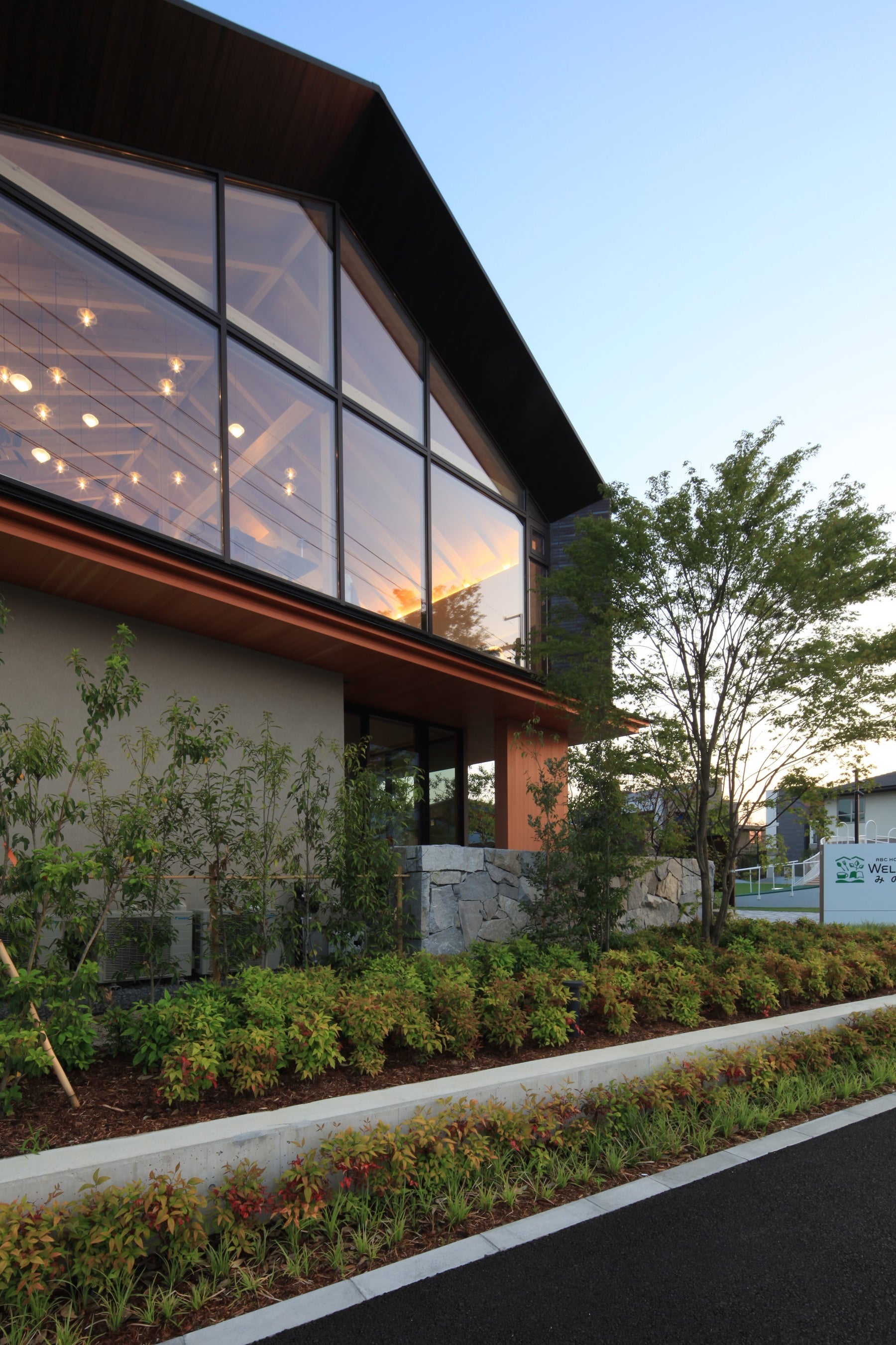 <妻壁を大開口サッシとし外部からも木組みの美しさを感じられる設計>