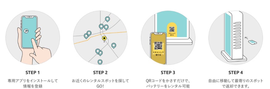 専用アプリから近くのバッテリースタンドを探してバッテリー(最大168時間)を借り、全国各地の別のバッテリースタンドに返却することができます。
