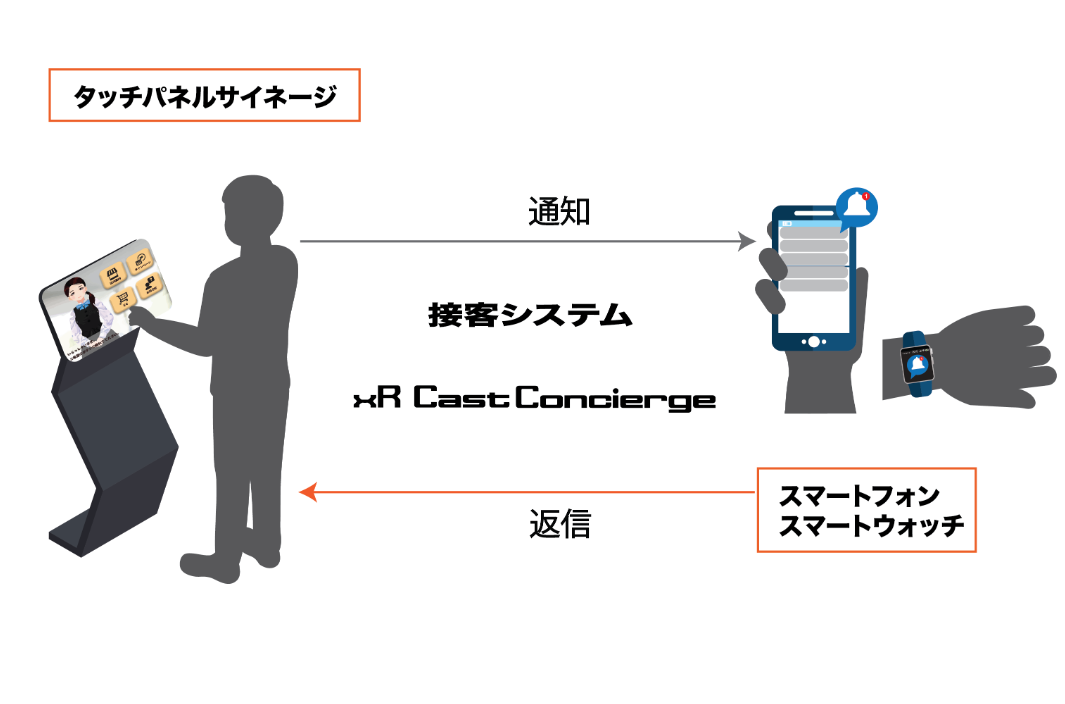 店舗に来店されるお客様のお悩み事に応じて、3DCGのバーチャル店員によるご案内を行う自動応対システムです。個別対応が必要なお客様には、担当の店頭スタッフさんが携帯しているスマートフォンや、スマートウォッチに通知を行うことで、遠隔でのリモコン操作による回答や動画コンテンツ案内を行い、遠隔で接客することも可能です。アバター接客システム「xR Cast HoloPhone」と連携することで、有人リモート接客にも対応しております。