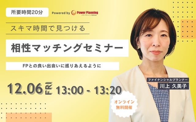 12月6日(金)13時より、スキマ時間を活用して自分に合ったFPを探すことができる、川上 久美子講師との「相性マッチングセミナー(無料)」を開催いたします。