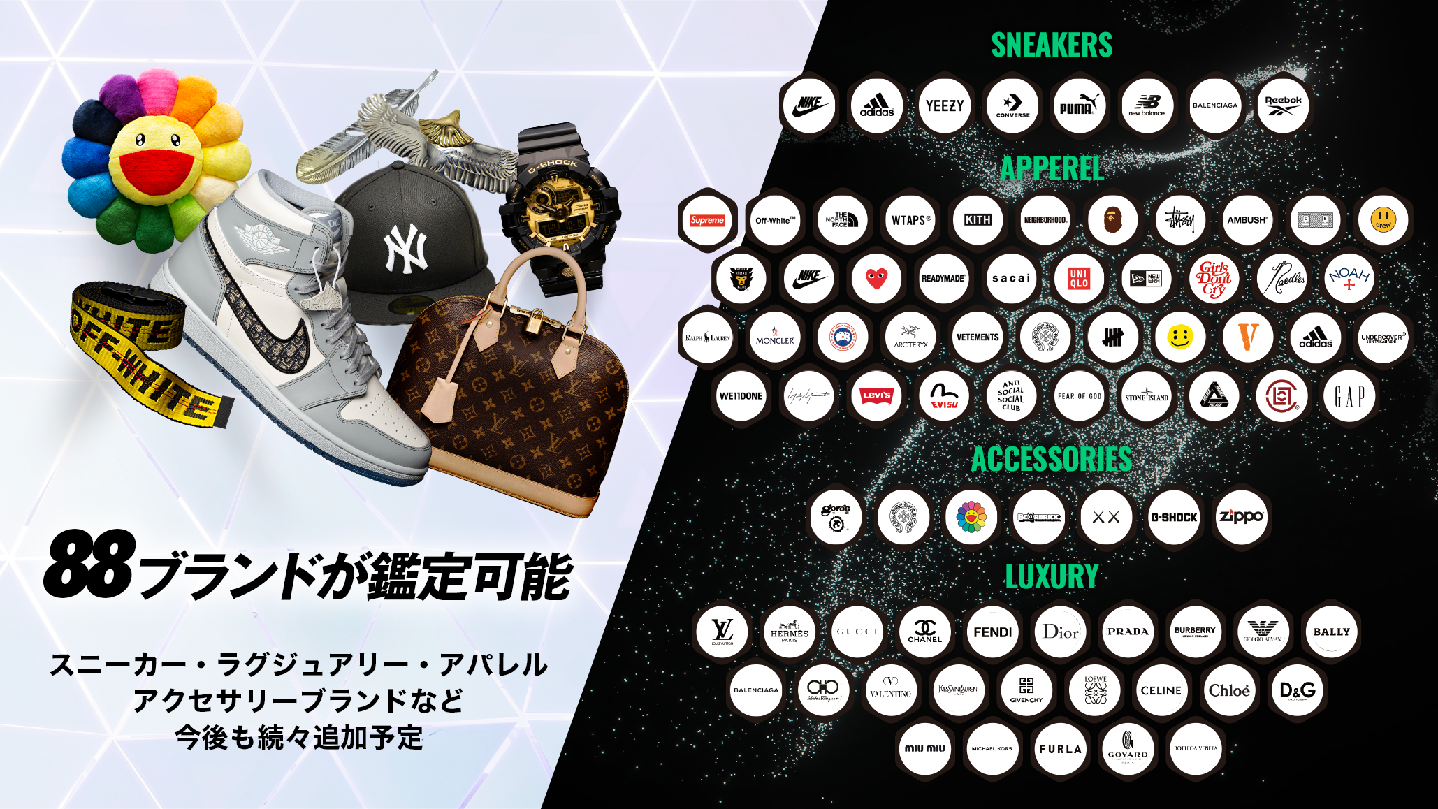スニーカーブランドをはじめ、ラグジュアリーブランド、アパレルブランド、アクセサリーブランドなど88のブランドを鑑定することが可能で、今後も対応ブランドを追加してまいります。