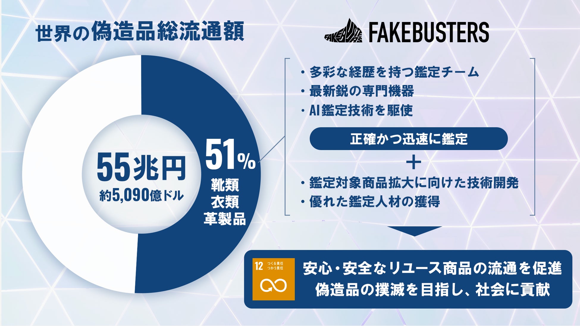 今回調達した資金は、「フェイクバスターズ」の鑑定領域の拡大、及びグローバル展開を見据え、AI技術の強化や鑑定キャパシティの拡張、新規事業開発等に充てる予定です。2025年には3.5兆円規模になると予測される(※2)リユース市場を支え、SDGsに貢献してまいります。
