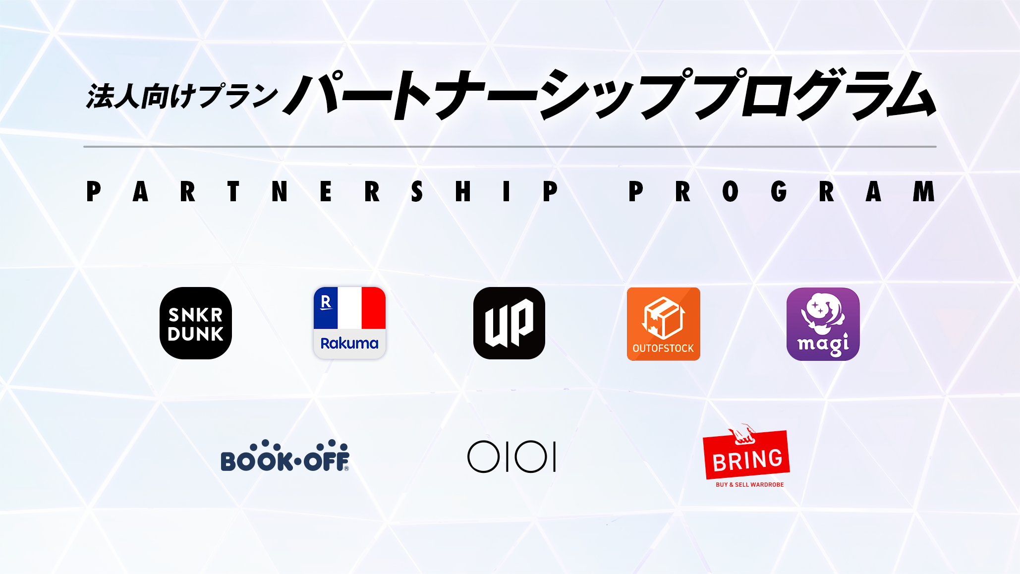 スニーカーフリマ「スニーカーダンク」、楽天のフリマアプリ「ラクマ」、コレクターフリマ「magi」、韓国初のスニーカーフリマ「OUT OF STOCK」、台湾のスニーカーフリマ「UP」、国内最大級リユースチェーン「ブックオフ」、国内最大級ブランドリユース「BRING」、百貨店「マルイ」、など数多くの企業と業務提携を締結しています。