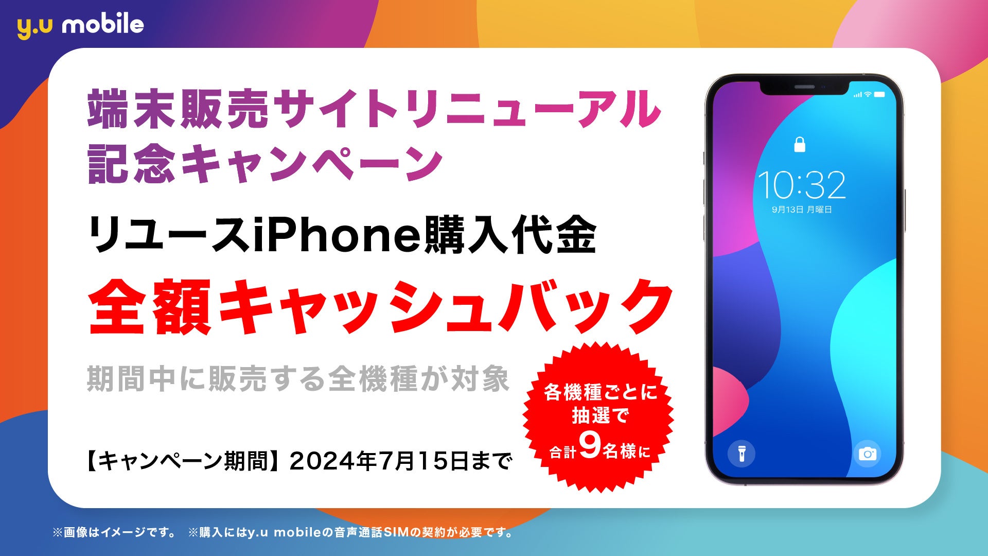 本日より端末販売サイトのリニューアルを記念して、対象期間中に販売中のリユースiPhoneを購入いただいた方の中から、機種ごとに抽選で1名様(合計9名様)に端末購入代金が全額キャッシュバックされるキャンペーンを実施します。