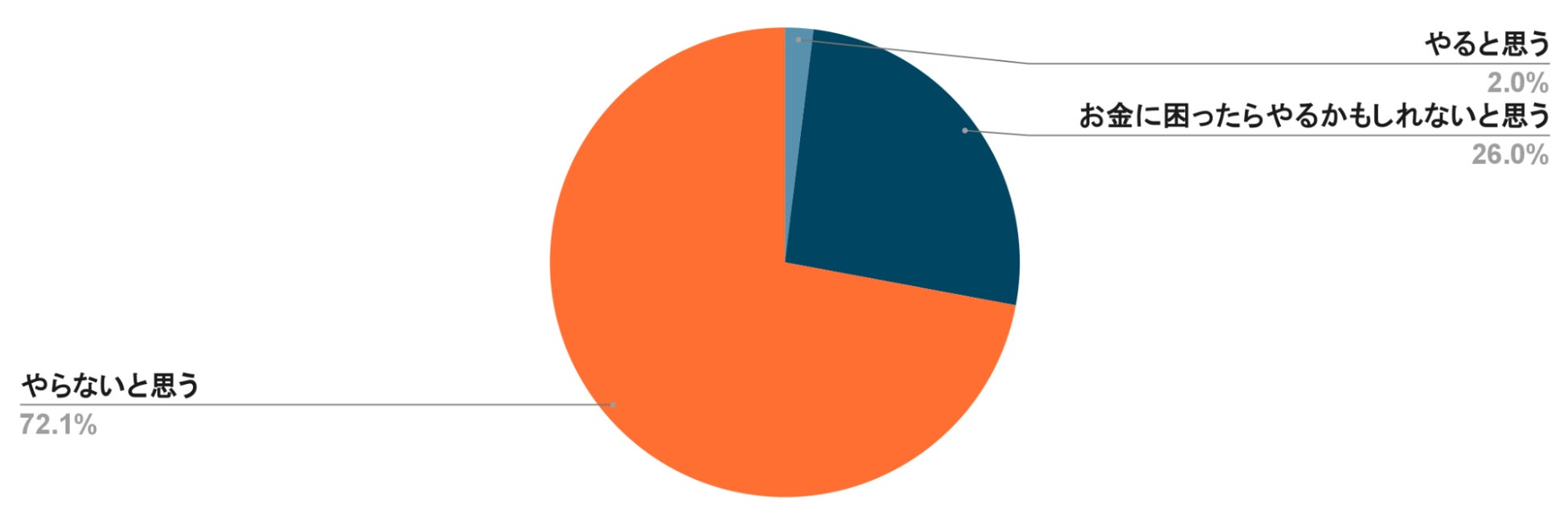 4人に1人が「今後、闇バイトに誘われた場合、お金に困ったらやるかもしれないと思う」と回答しました。理由としては8割以上が「生活費・奨学金返還・病院代・税金支払いなどにお金が必要なため」と答え、生活費など生きていく上で必要なものの補填のために闇バイトをお金に困った際の一つの選択肢として検討していることが判明しました。