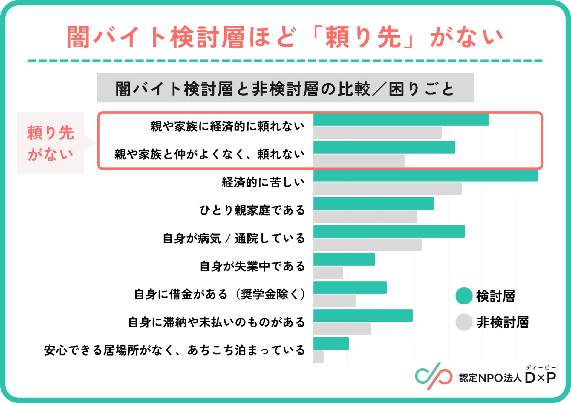 闇バイト検討層(n=143)・非検討層(n=369)で比較してみると、大きく差がある困りごとは「経済的に苦しい」(22.5ポイント差、1.51倍)、「親や家族となかがよくなく、頼ることができない」(15.2ポイント差、1.57倍)、「親や家族に、経済的に頼ることができない」(13.5ポイント差、1.35倍)となり、経済的に苦しい状況と、いざとなったときの頼り先がない状況が浮き彫りになりました。比率に差があるのは「安心できる家・居場所がなくあちこちに泊まっている」(3.5倍)であり、安定した住居・仕事を持てていないことも示唆されます。