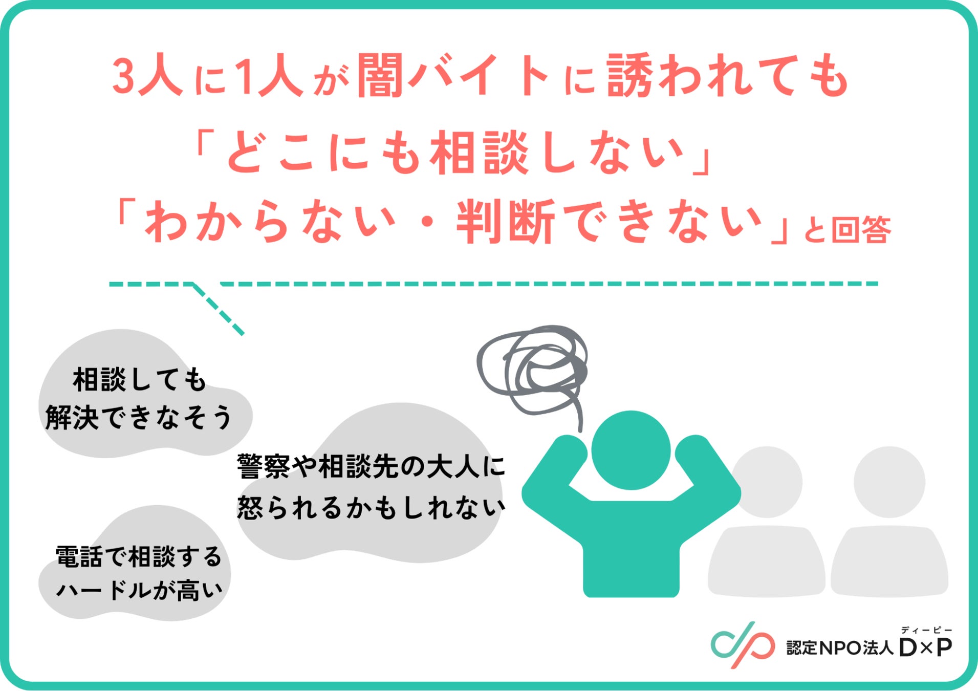 孤立するユース世代の支援を行なう認定NPO法人D×P(大阪府大阪市、理事長:今井紀明、以下「D×P」)は、13〜25歳に向けたLINEを使った進路・就職・生活相談サービス、「ユキサキチャット」を運営しています。今回、ユキサキチャット登録者の13〜25歳を対象に「闇バイトに関するアンケート」を実施しました。