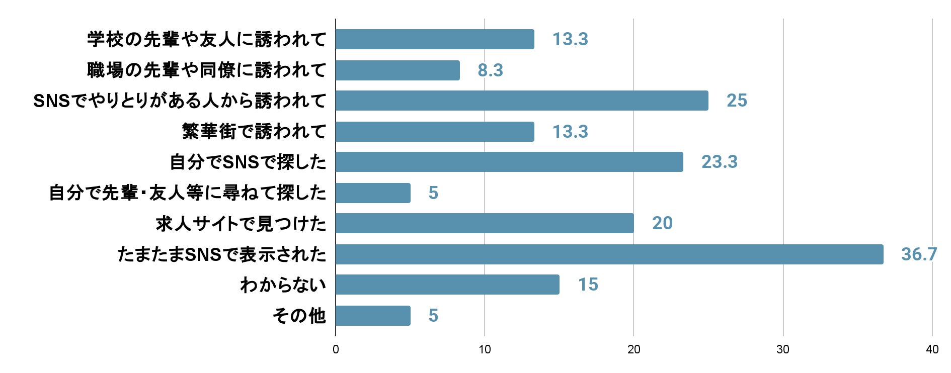 39.8%が「実際にあやしい求人を見たり誘われた経験がある」、11.7%が「実際に経験がある・周囲に経験ある人がいる」と回答しました。どこで求人を見つけたのかという設問には3人に1人以上が「たまたまSNSで表示された」と回答。その他、「SNSでやりとりがある人から誘われて」「自分でSNSで探した」「求人サイトで見つけた」という声も多く見られました。闇バイトは困窮する若者の身近に迫っていることが判明しました。