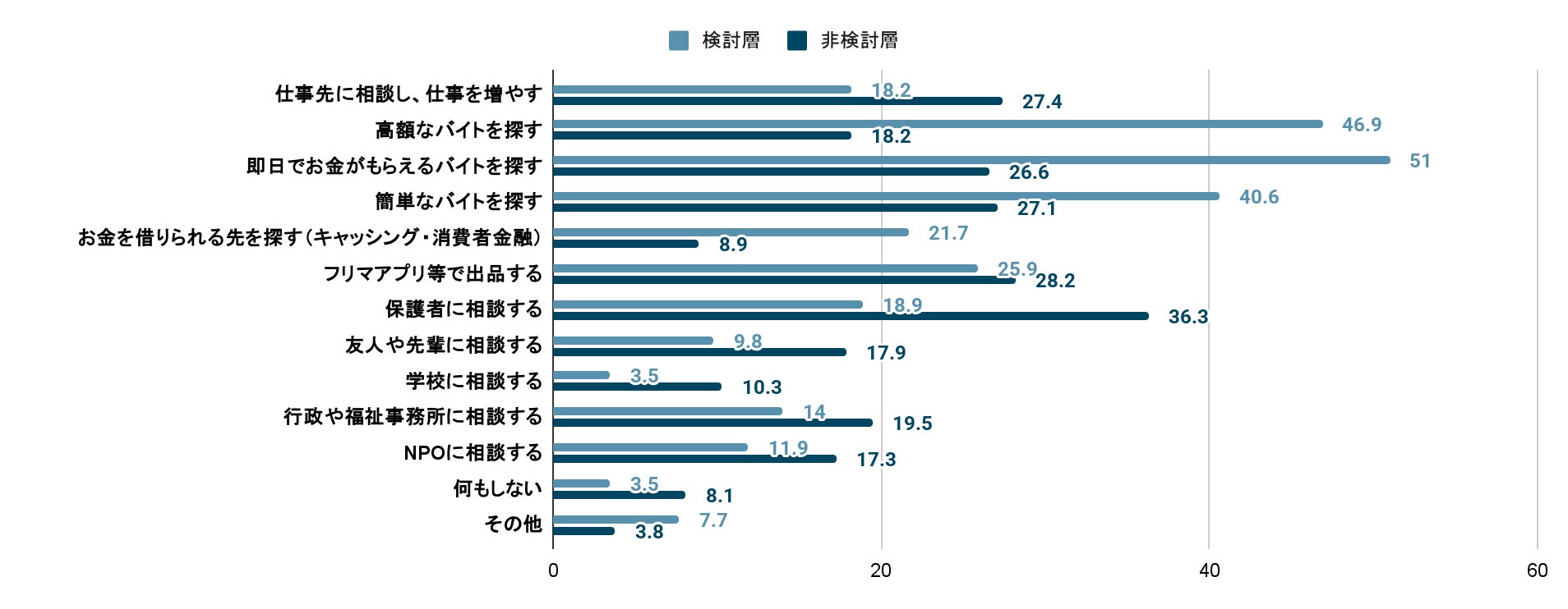 また、生活費に困った時にどうするかに対しては、検討層・非検討層で大きく差があるのは「高額なバイトを探す」(28.7ポイント差、2.58倍)、「即日でお金がもらえるバイトを探す」(24.4ポイント差、1.92倍)、「保護者に相談する」(-17.4ポイント差、0.52倍)である。比率に差があるのは「お金を借りられる先を探す(キャッシング・消費者金融)」(2.44倍)となりました。闇バイト検討層は、非検討層と比べると、仕事先・保護者・友人・学校・行政・NPO等、いずれにも相談しない傾向を示しており、周囲に相談せず(できず)、高額・即金バイトや借金先を探すなどひとりでなんとかしようとする傾向がみられます。