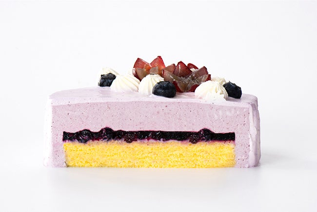 巨峰ムースに、ブルーベリーなどの6種類のベリーを使ったジュレと、ふんわりとしたマドレーヌ生地を合わせ、青と紫を基調に輝くスターサファイアをイメージした巨峰を飾りました。
