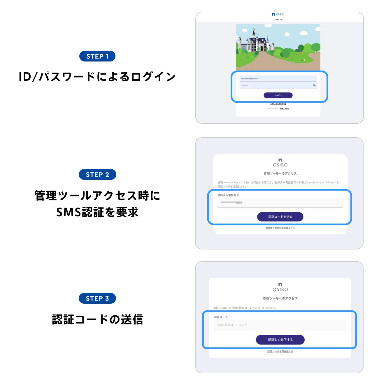 OSIROではこれまで、ID・パスワードでのログインが必要でしたが、それに加えて、管理ユーザーが管理ツールにアクセスする際にはSMSを利用したワンタイムパスコードを組み合わせた二要素認証に対応できるようになりました。