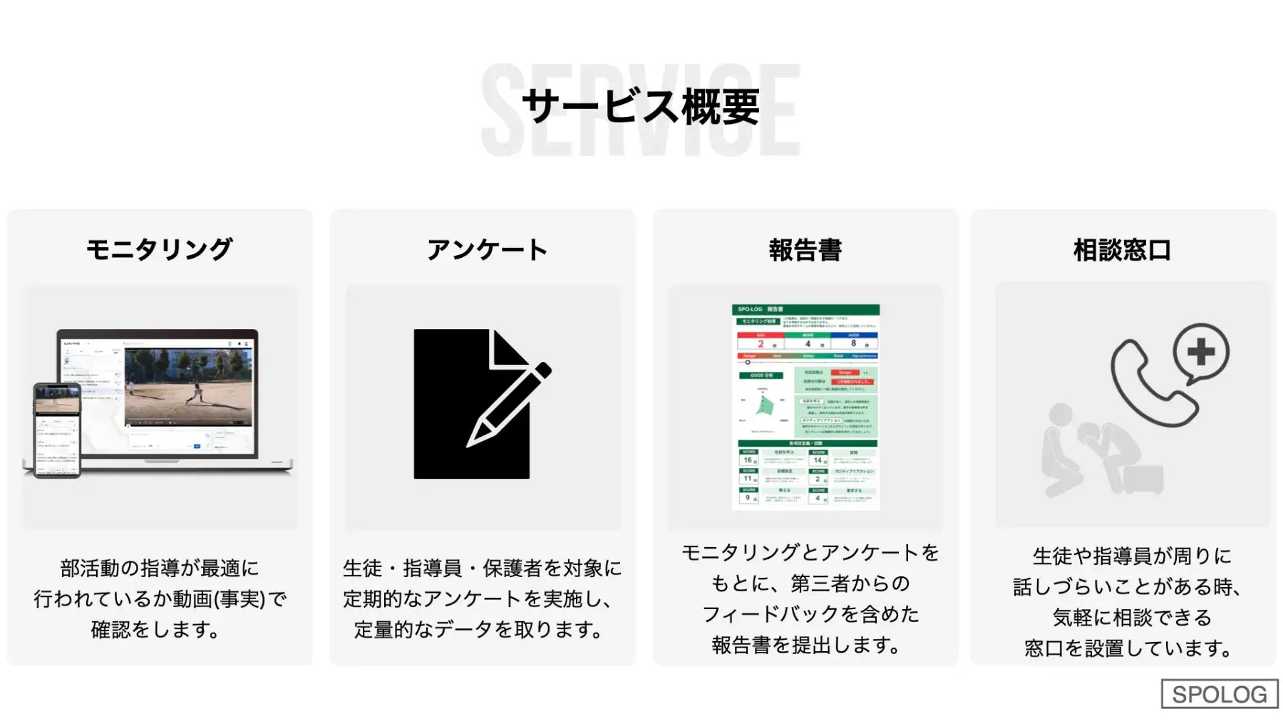 『SPO-LOG』は、地域展開が進む部活動の現場において、生徒の安心・安全を確保し、指導者や関係者の健全な活動を支えるために開発されたモニタリングサービスです。