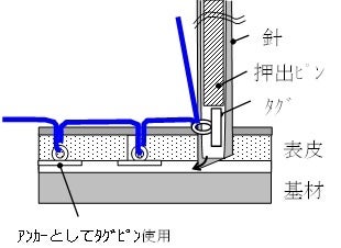 タグステッチでは、下糸の代わりにタグを用い縫製対象物に対して上方向から縫製します。
