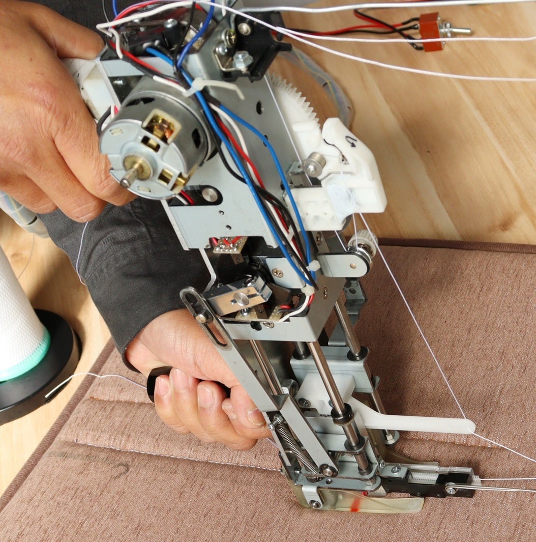 このミシンを成立させる要素技術は、トヨタ車体株式会社が保有している特許技術「タグステッチ工法」です。同社の得意とする真空成型技術による自動車用内装部品(湾曲している立体形状物等)に直接、加飾縫製を可能にした画期的な技術です。同社いなべ工場で生産している 現行アルファードのダッシュボードを始めとするインテリア周りに加飾縫製による高級感を演出するために使われています。この技術では、糸を通したタグピンを対象物に直接打ち込み縫い付けることが可能で、タグピンが糸抜けを防止する役割を果たすことで縫合、縫製ができる仕組です。私たちが開発を進めているMIRAIミシンは、この利点に着目し、タグピンメーカーの株式会社トスカバノックの協力も得ながら新技術を開発。身近なモノではソファなどの立体物(湾曲した形状含む)に対して直接縫合や縫製することを可能に。現在、2026年実用化に向け開発を進めています。