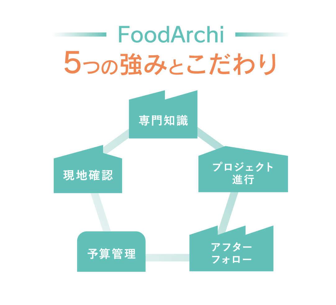 「HACCPの専門知識」「徹底した現地確認」「プロジェクト進行支援」「予算管理」「安心のアフターフォロー体制」といった5つの強みがセットとなった新サービスとして、 “おいしい”を安心してつくれる食品工場の建設を最適なプロセスで提供します。