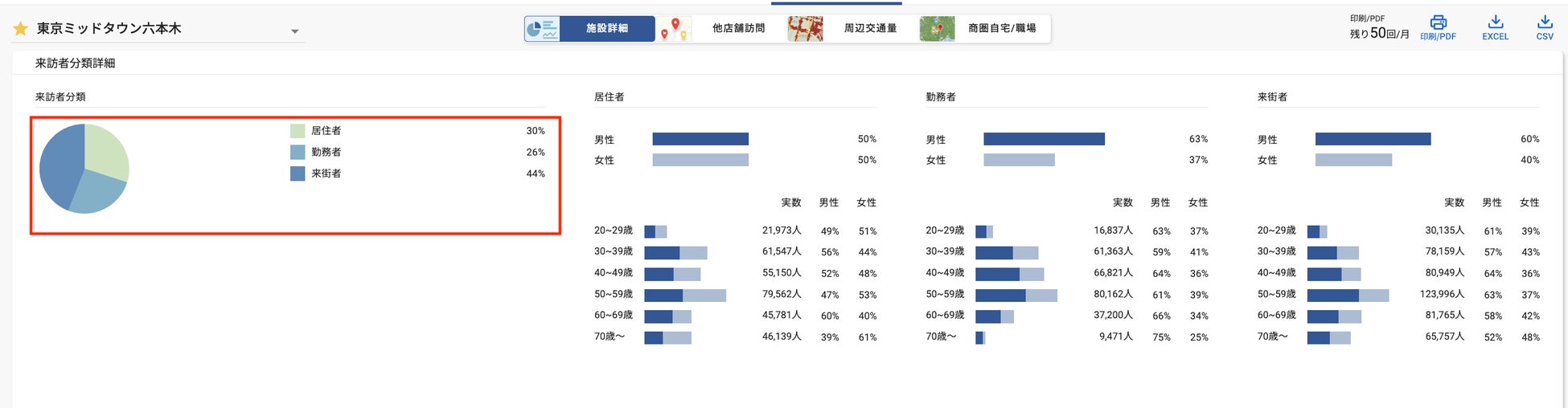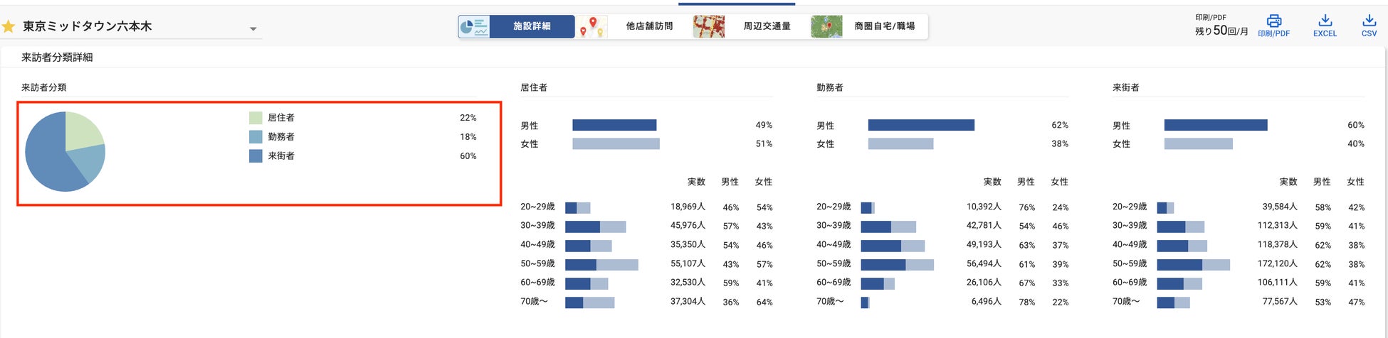 DWAMの「施設分析」機能には、登録した施設への来訪者が近隣の居住者なのか、勤務者なのか、来街者※1なのかを判別する「居住者/勤務者/来街者 分析」機能があります。