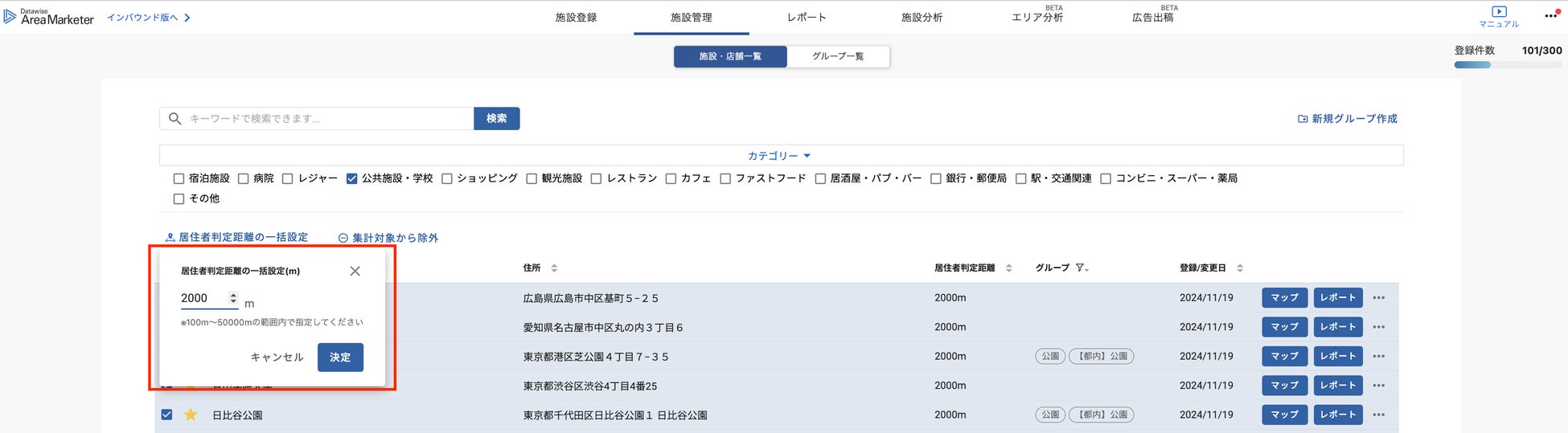 これまでは、判定の基準は来訪者の自宅/職場がGPSの計測された施設から「3km」以内にあるかどうかという「固定距離」で統一されておりました。今回のアップデートにより、居住者/勤務者/来街者 判定距離を施設ごとに設定・変更できるようになります。変更した値による分析結果は、「施設分析」、「期間比較レポート」、「施設比較レポート」の来訪者分類の集計結果へ反映されます。