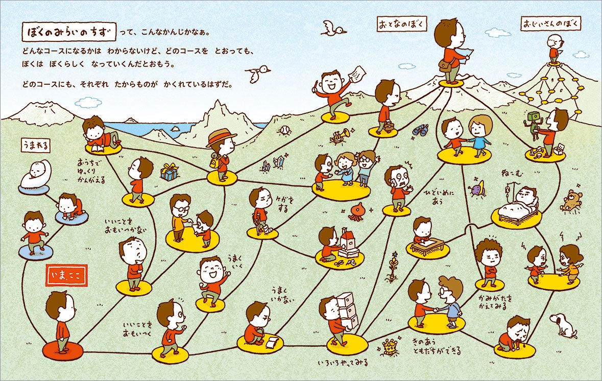 シリーズ第5作目となる本書のテーマは「地図」。主人公のゆうくんは、お母さんの描いた地図を頼りにおつかいにでかけます。地図は自分が今いる場所を把握できたり、目的地までの道順を示してくれます。情報を絵にして分かりやすくしたものが「地図」だとしたら、何かの仕組みや考え方の地図もあるかもしれない……と想像をふくらませていきます。