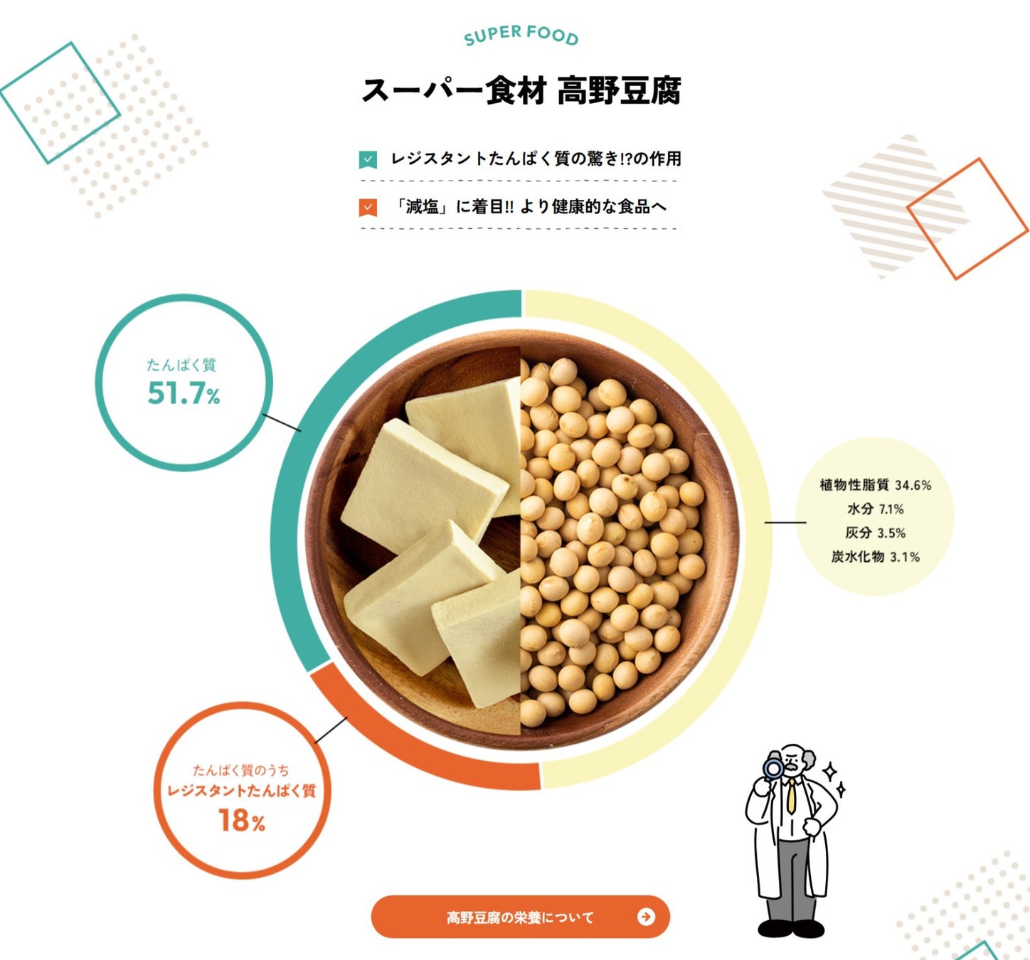「畑の⾁」と⾔われる⼤⾖の成分を抽出・濃縮した⾼野⾖腐は、たんぱく質・鉄分・カルシウムなど豊富な栄養素を含んでいます。特に注⽬されている“レジスタントたんぱく質”の健康効果を詳しく解説。また、最新の研究結果も紹介しています。