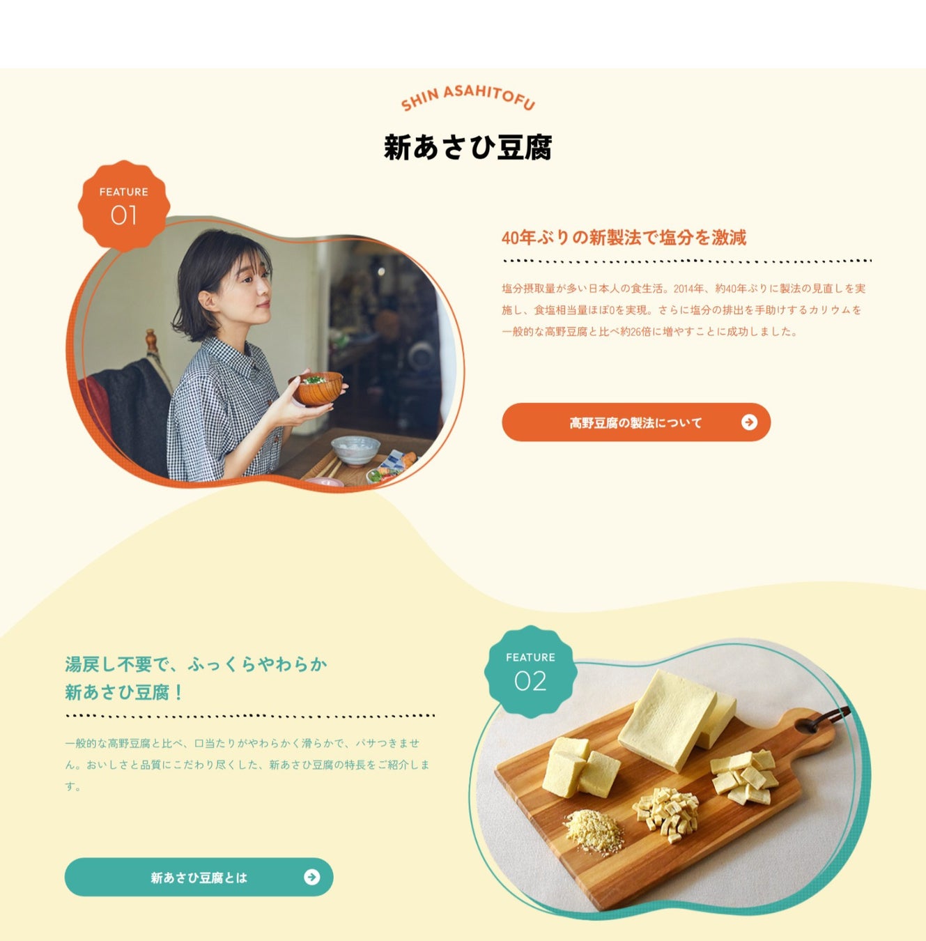 創業以来、75年以上⾼野⾖腐を作り続けている旭松⾷品の「新あさひ ⾖腐」シリーズはカテゴリ市場売上No.1(※)。より健康的で簡単においしく⾷べたいというお客様のニーズを受け2014年、特許取得のカリウム製法に 変更し95%減塩に成功しました。現在では更なるおいしさを追求し、出来⽴ての状態が⻑持ちする⾼オレイン酸⼤⾖を使⽤した⾼野⾖腐に、順次切り替えています。