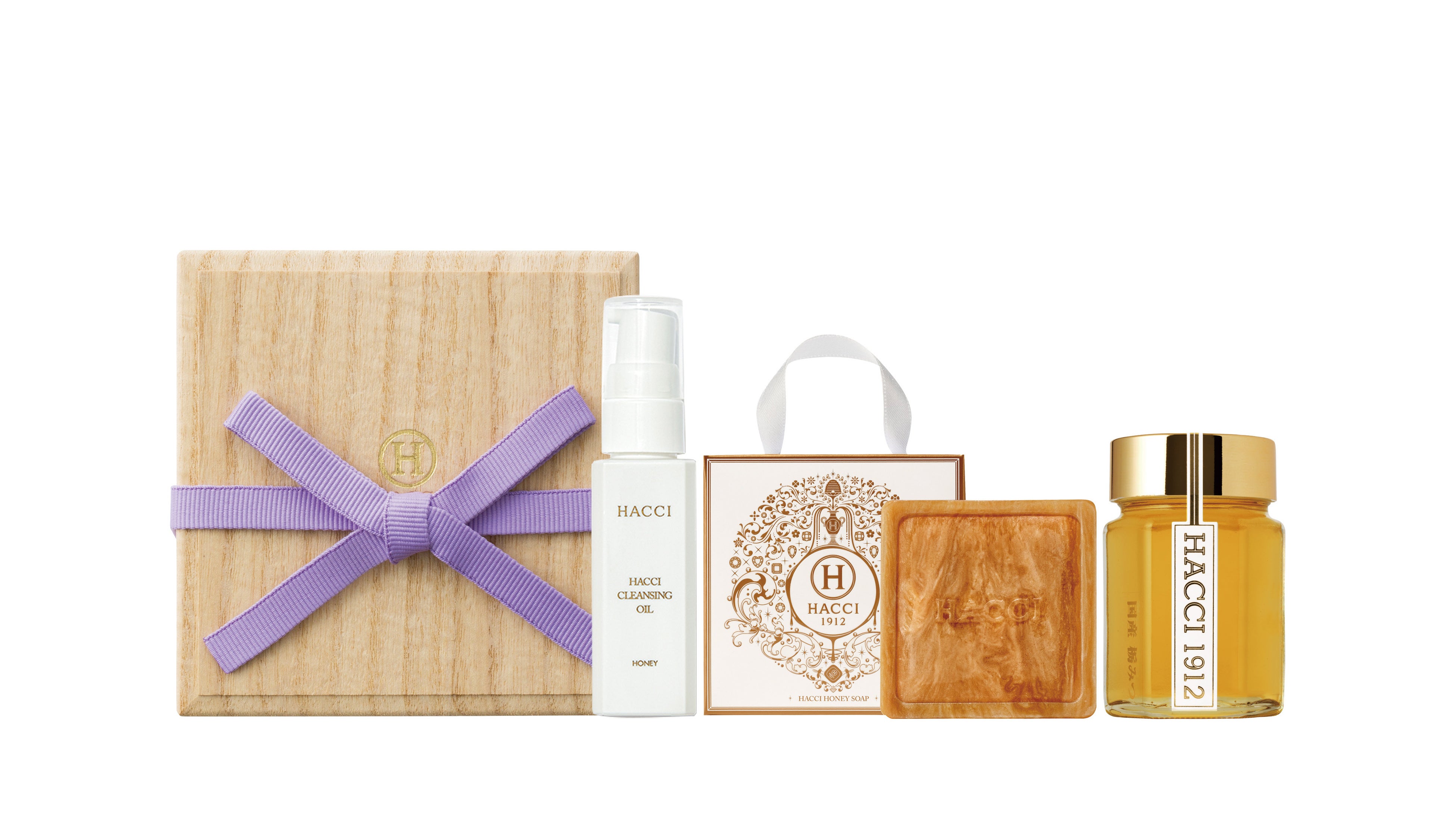 優雅な菫色の紐を掛けた桐箱の限定セットは、ロングセラーのはちみつ洗顔石けんと浸透力抜群の導入美容液、濃密なローションなど、HACCIを代表するコスメと厳選したはちみつがたっぷり楽しめます。京都タカシマヤ限定セットではちみつ美容をご堪能ください。