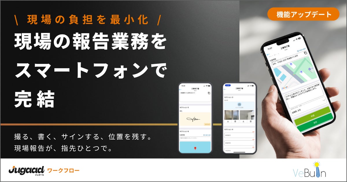 ワークフローシステム「ジュガール」を提供するVeBuIn株式会社(本社:茨城県つくば市、代表取締役:シャー バビック)は、現場の報告業務をスマートフォンで完結させることを目的に、大幅な機能アップデートを実施しました。従来のワークフローシステムの枠を超え、ノーコードで簡単に業務アプリを作成・運用できる「業務アプリ開発ツール」として、より多様な現場業務に対応可能になりました。