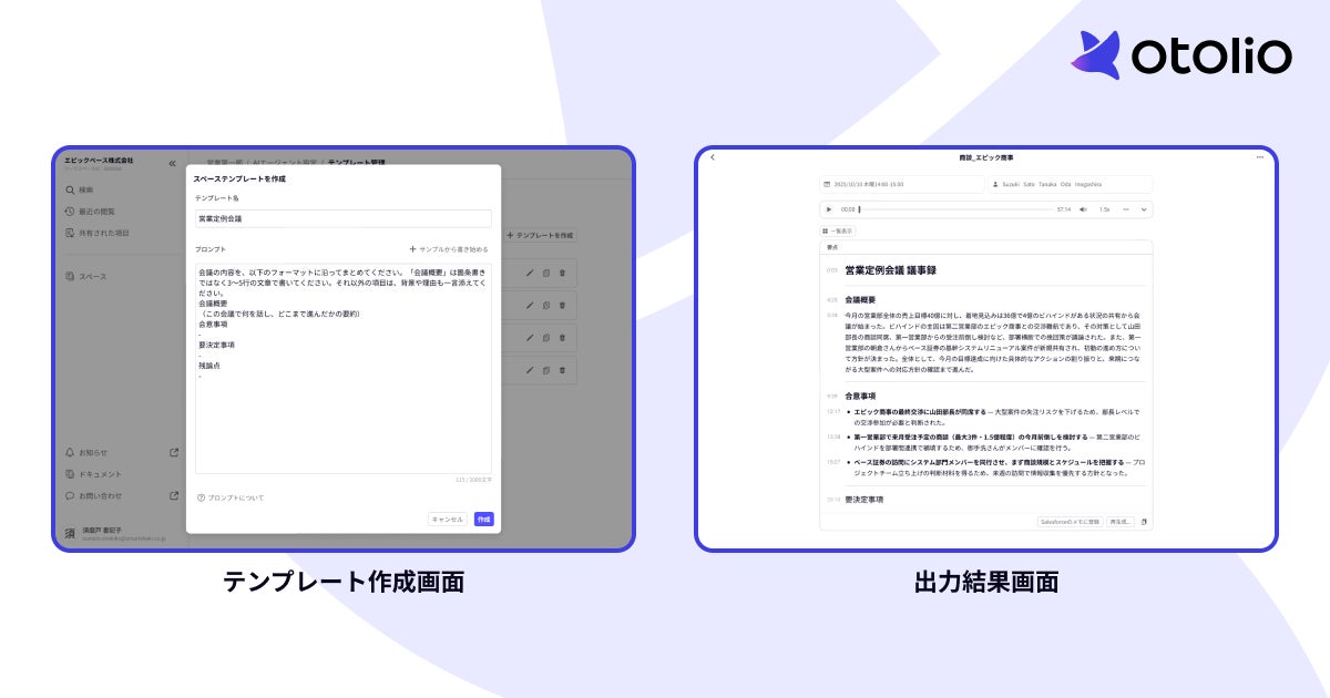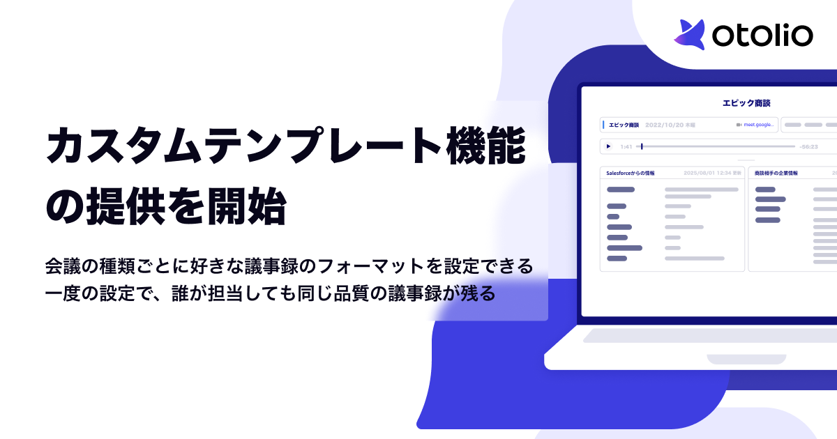エピックベース株式会社(本社:東京都品川区、代表取締役:松田崇義)は、議事録作成などの会議に関わるあらゆる業務を自動で実行してくれるAIエージェントサービス「Otolio」において、会議の種類ごとに好きな議事録のフォーマットを設定できる「カスタムテンプレート機能」の提供を開始いたしました。
