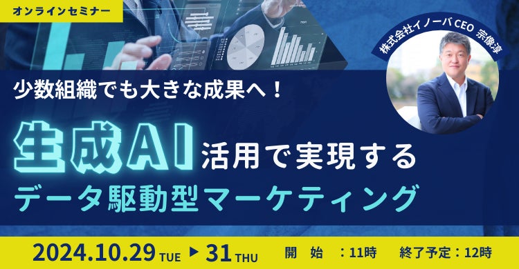 株式会社イノーバ(東京都新宿区、代表取締役:宗像 淳)は、2024年10月29日(火)~31日(木)の3日間、「少数組織でも大きな成果へ!生成AI活用で実現するデータ駆動型マーケティング」と題し、BtoB企業向けに生成AIを活用したマーケティングセミナーを開催いたします。