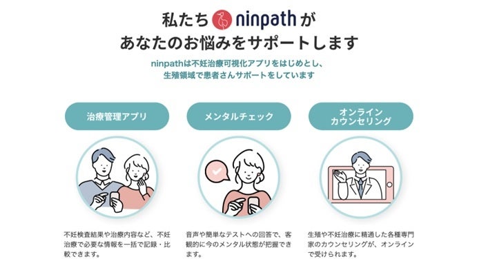 不妊治療の記録・管理はもちろん、ご自身の状況に近い第三者の治療データと比較することができる不妊治療可視化アプリです。子どもを望まれる方は年齢・身体の状態など、お一人お一人の状況が異なる上、医療機関によって不妊治療の治療方針が異なるのが現状です。そこで『ninpath』では、不妊治療の周期毎の記録・管理のみならず、ご自身に近い第三者の治療データ等と比較することで、自分自身の客観的な状況を把握することができ、今後の指針を考えるきっかけを提供しています。また、生殖に関する悩みなどを専門家がサポートするオンラインカウンセリングも提供しています。