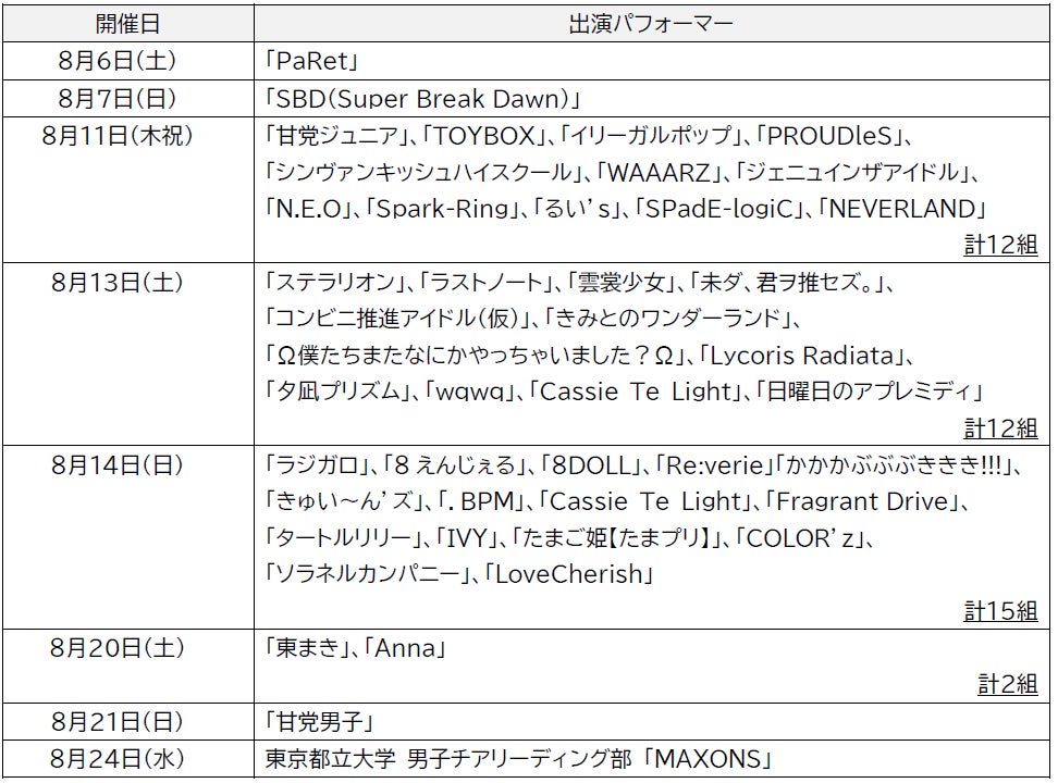 8月中はアイドルユニットやダンスチームなど、多数のパフォーマーが、週替わりで屋外プールサイドステージに登場し、夏を最大限に感じるステージショーをお届けいたします!