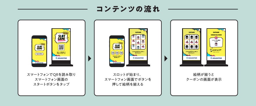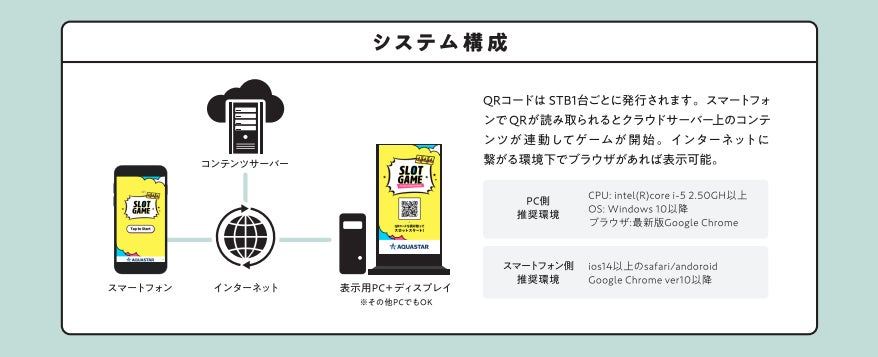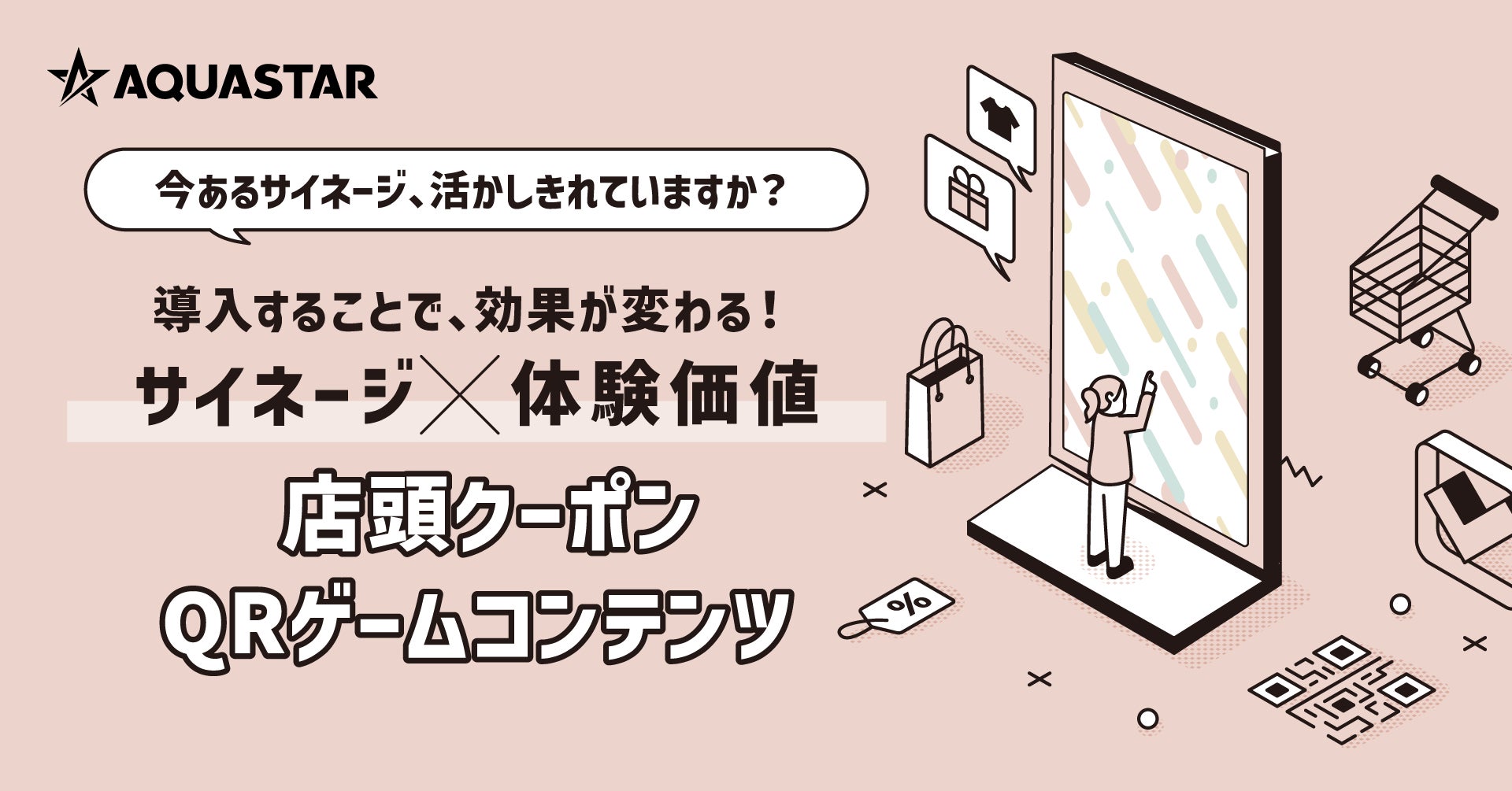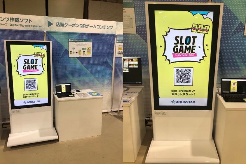 イラストやデジタルコンテンツの企画・制作を⾏う株式会社アクアスター (所在地:東京都中央区、代表取締役社⻑:原⽥ 弘良、以下 当社)は、デジタルサイネージ(電子看板)を活かした新サービス「店頭クーポンQRゲームコンテンツ(以下本サービス)」を開発しました。本サービスは、集客促進、販売促進を目的とした新規オープン店舗や期間限定のイベント向けゲームコンテンツです。店舗でのネット環境、PC、サイネージがあれば導入可能で、システム機器が苦手な店舗従業員でも簡単に操作ができる点が特徴です。今回、当社はシャープマーケティングジャパン株式会社(所在地:東京都港区、代表取締役社長:美甘將雄、以下SMJ)と協業し、全国5拠点で開催中のSMJ法人向け総合提案会『シャープビジネスソリューションフェア』にて展示を行っています。