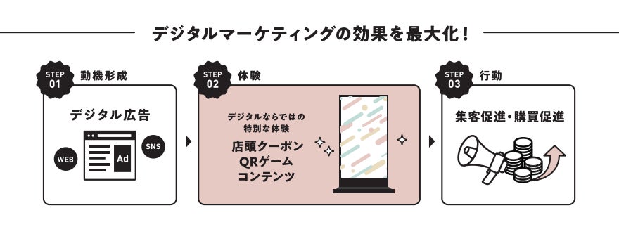 本サービスは、アプリインストール不要で、デジタルサイネージに表示されたQRコードをお手持ちのスマートフォンで読み込むだけで気軽にご体験できます。結果に応じてクーポン等のインセンティブが付与される設計にしたことで、コンテンツ体験の誘導から購買を促す効果があります。