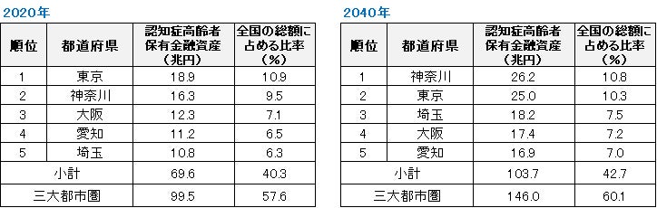 三井住友信託銀行株式会社(取締役社長:大山 一也)は、当社が独自(※1)に推計した認知症高齢者が保有すると推定される全国の「資産総額」、「金融資産」、「不動産」を発表しました。全国の認知症高齢者が保有すると推定される資産総額は、2020年で約250兆円、2040年には約345兆円にまで増加することが分かりました。また、都道府県別でみると、東京都を中心に三大都市圏に集中している一方で、北海道と福岡県が金融資産で5兆円を上回り、また、2020年から2040年への不動産の増加率では、沖縄県が最大、宮城県が次点となるなど地方の意外な結果も浮き彫りになりました。