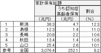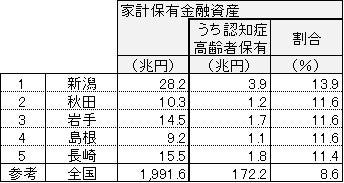 最後に、都道府県別に家計保有資産に占める認知症高齢者保有の資産割合を算出しています。金融資産では、東京都は6.6%と2番目に少ない水準である一方、新潟県が13.9%と東京都の2倍以上の水準となっています。また、不動産でみると、東京都は認知症高齢者が保有する不動産が群を抜いていることもあり高い水準となっていますが、金融資産と不動産の総額では金融資産での割合が大きく、新潟県が最大の割合となっています。新潟県は高齢者比率が岩手県などと並んで高い上、高齢層が保有す金融資産額が相対的に大きいことが要因と推測されます。