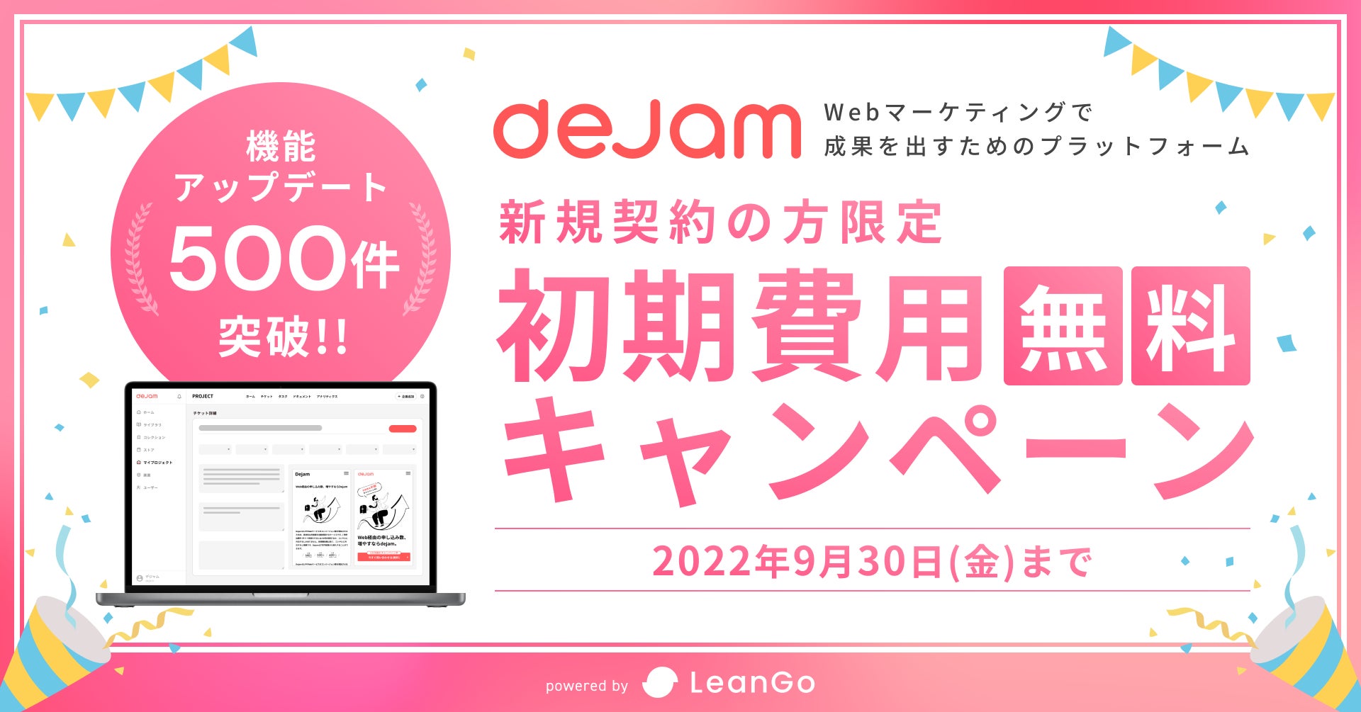 株式会社LeanGo(本社:東京都品川区、代表取締役:平井 翔吏 以下 弊社)は、自社サービスのdejamで機能アップデート数が500件を突破した記念として、2022年9月30日までにdejamの有償プランを新規ご契約いただいた方を対象に初期費用無料キャンペーンを実施いたします。