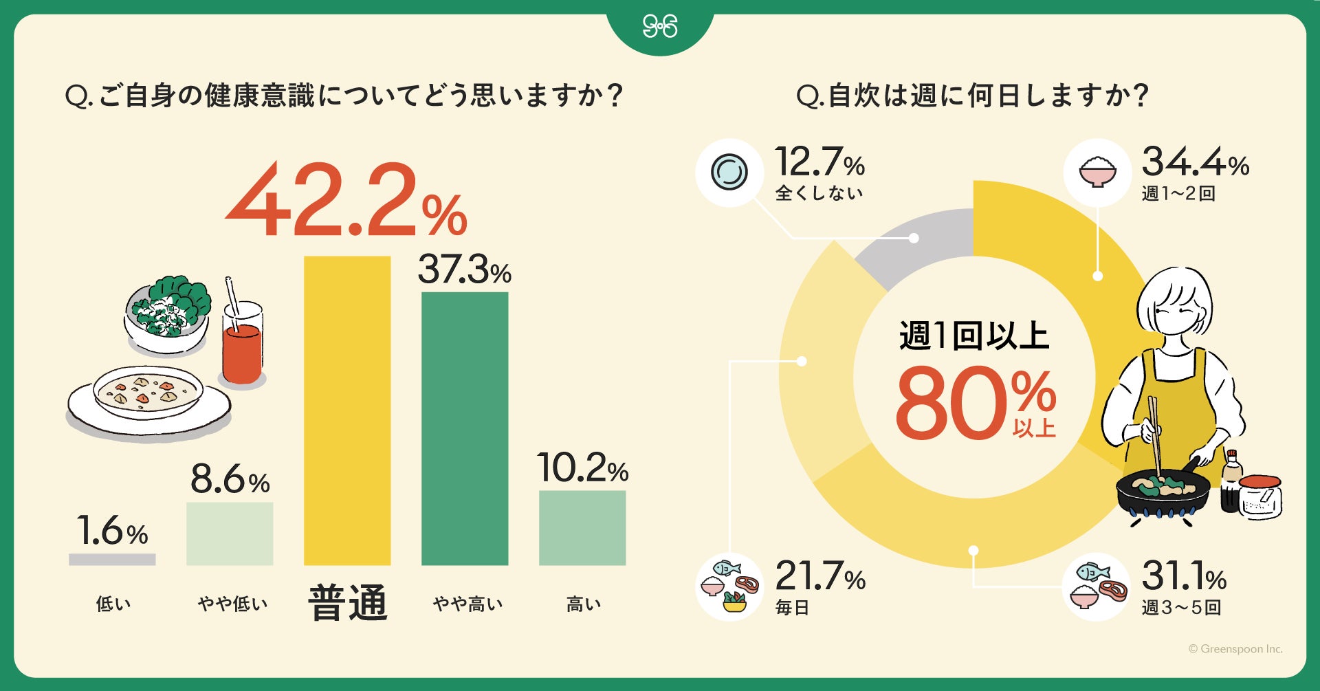ご自身の健康意識についてアンケートしたところ、「普通だと思う」が42.2%ともっとも多かった回答に。さらに週1回以上の自炊習慣があるユーザーが80%以上という結果となりました。