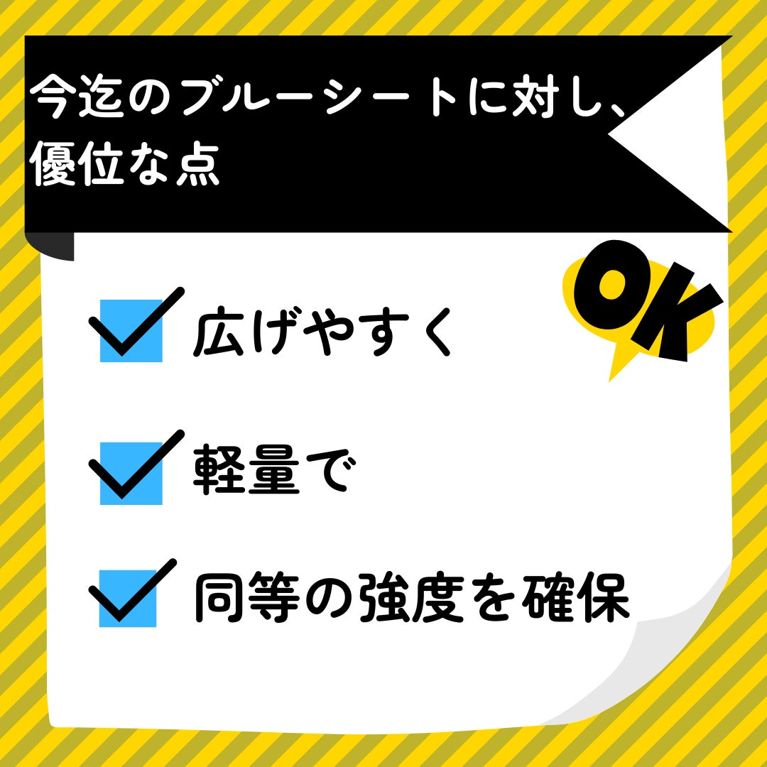 同商品は、上記のお悩みを解決すべく、下記の4つの「開発の視点」より開発し、シートの四隅にロープ配し、畳み方を工夫しました。また、今迄のブルーシートに対して、下記の3つの「優位な点」も実現することが出来、すでに特許の取得も行っております。