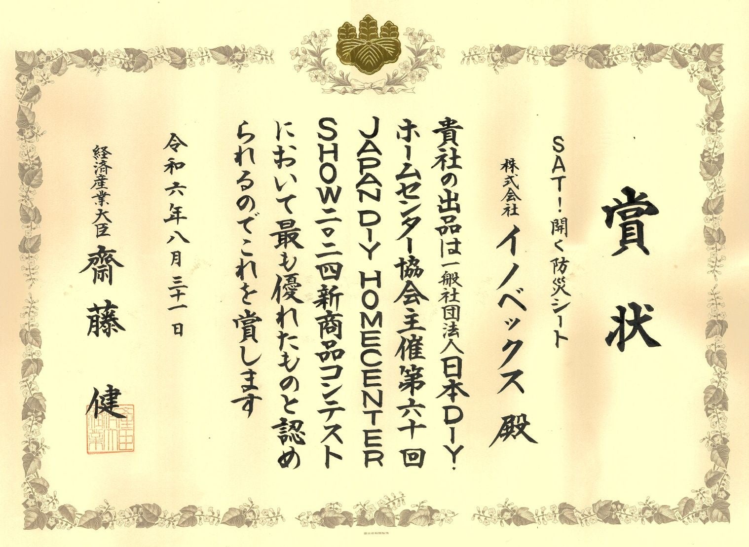 この度、株式会社イノベックスが出展したホームセンター業界最大の総合展示会である第60回JAPAN DIYHOMECENTER SHOW 2024(以下、DIYショー、2024年8月29~31日、幕張メッセ)にて行われました新商品コンテストで、新商品「SAT!開く防災シート」が最高位となる経済産業大臣賞を受賞いたしました。