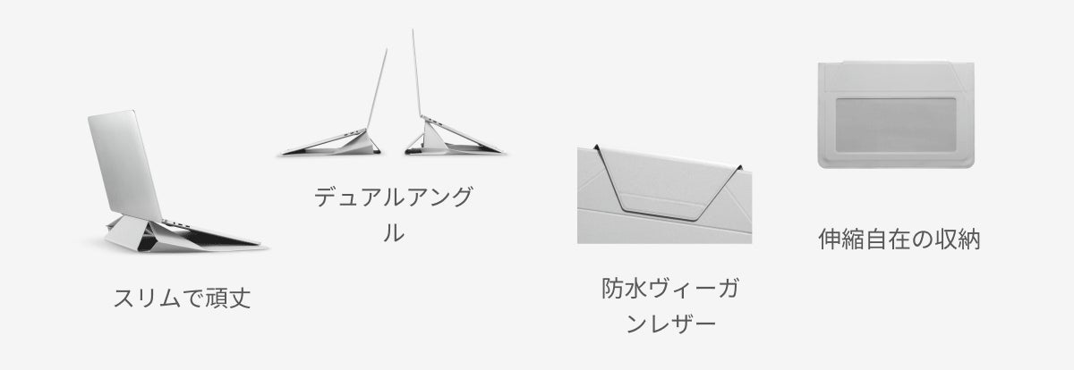 保護&収納しながら、サッとスタンドにもなり、旅先でもデスク上でも、どんな場所でもあなたのノートパソコンを支える、究極のワークライフバランスのためにデザインされた革新的なライトキャリーケース。インスピレーションが湧いた時、いつでもどこでも展開して作業開始でき、生産性を高めます。