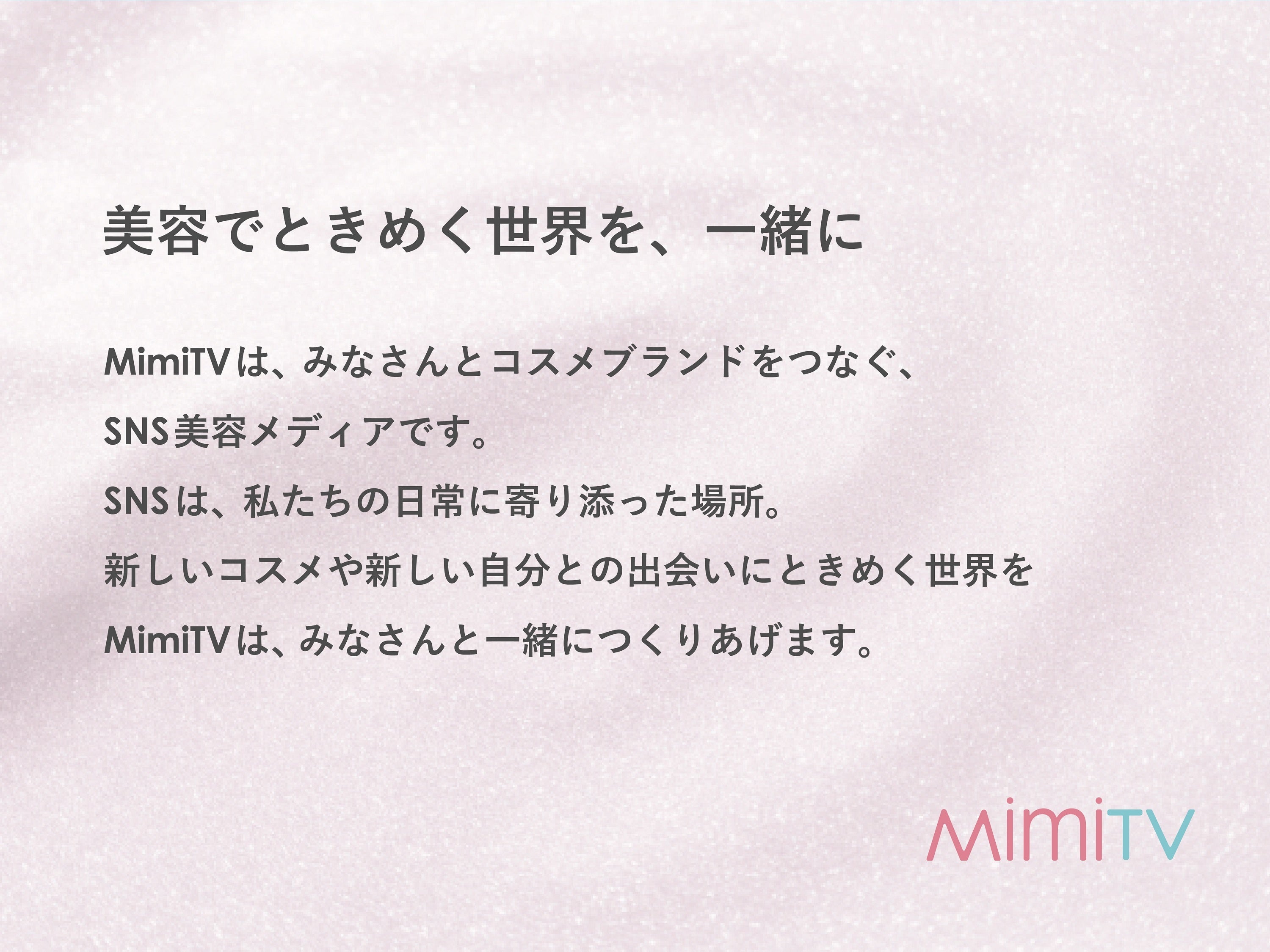 MimiTVの新しいブランドコンセプトは「美容でときめく世界を、一緒に」。SNS美容メディアとして、情報発信にとどまらず、ユーザーとともにつくりあげるメディアでありたいという思いを込めています。